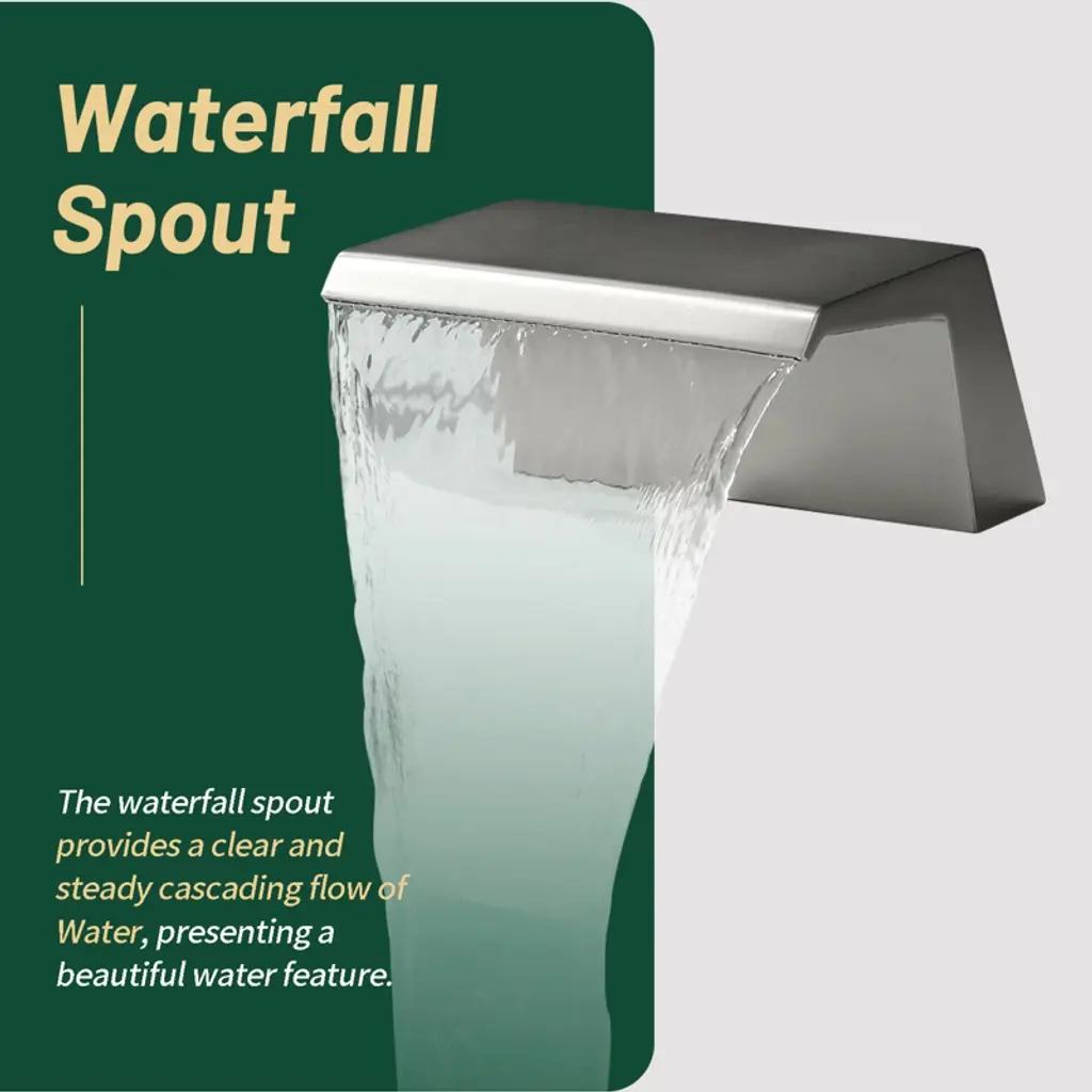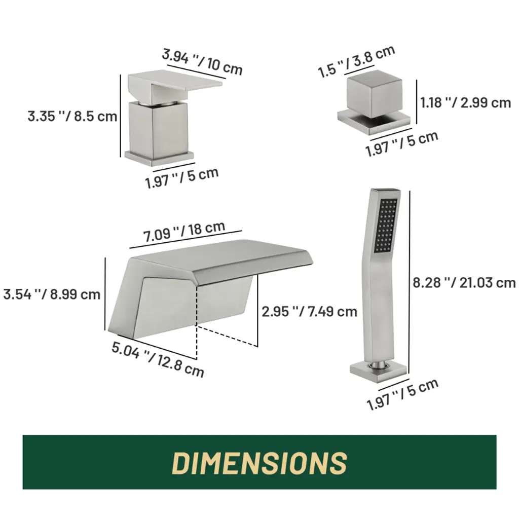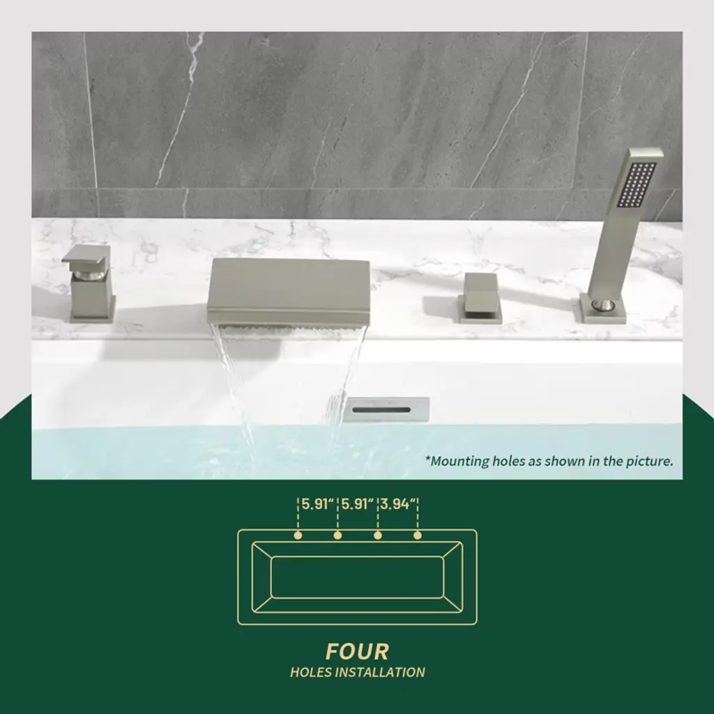 This bathtub faucet adopts an elegant and fashionable design style, which is able to adapt to a wide range of bathroom environments with bathtubs and naturally blend with common bathroom fixtures and decorative styles.Meanwhile, it is mainly made of brass and stainless steel, which is durable, not easy to rust and fade, prolonging the service life of the product, and combining aesthetics and practicality. The bathtub shower faucet set comes with handheld shower, bathtub faucet and 5 hoses.The bathtub faucet is designed with a 7.09-inch wide waterfall spout, the spout action is as neat as a waterfall, bringing you a stable water flow experience.The hand shower comes with a 59-inch hose with gravity ball, and the longer hose length effectively extends the shower's range of motion.At the same time, when the shower is finished, the gravity ball guides the hose back into place with its own gravity, keeping your bathroom clean and tidy, and providing you with a convenient and efficient experience. This shower faucet set adopts simple single-lever control, which is intuitive and convenient to operate, and can easily realize water flow adjustment.In addition, it is also cleverly equipped with a diverter knob, which can be switched between the bathtub faucet and the handheld shower with just a gentle turn.Whether you are immersed in the gentle embrace of the bathtub or enjoying the pleasure of the hand shower, it can be easily realized, creating an efficient and comfortable bathing environment for you, allowing the body and mind to get the ultimate relaxation under the caress of the water. This product adopts 4-hole installation method, reasonable layout is convenient for daily shower use. We have a professional after-sales team ready to provide you with support to ensure peace of mind.