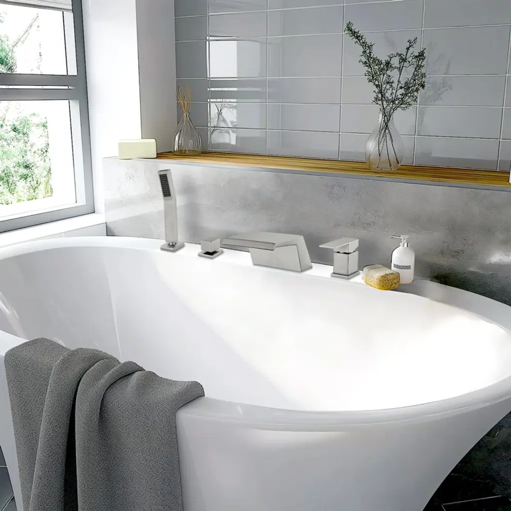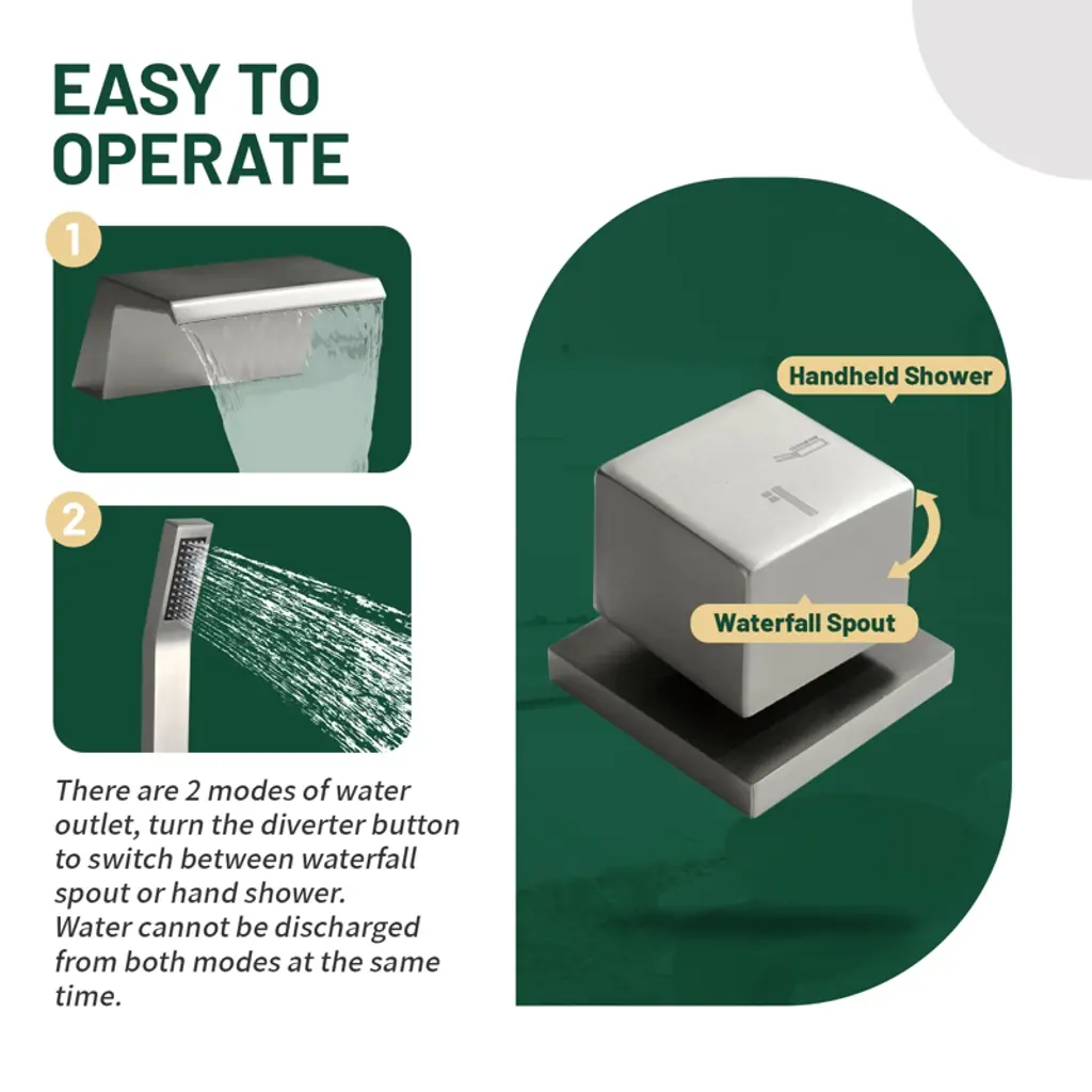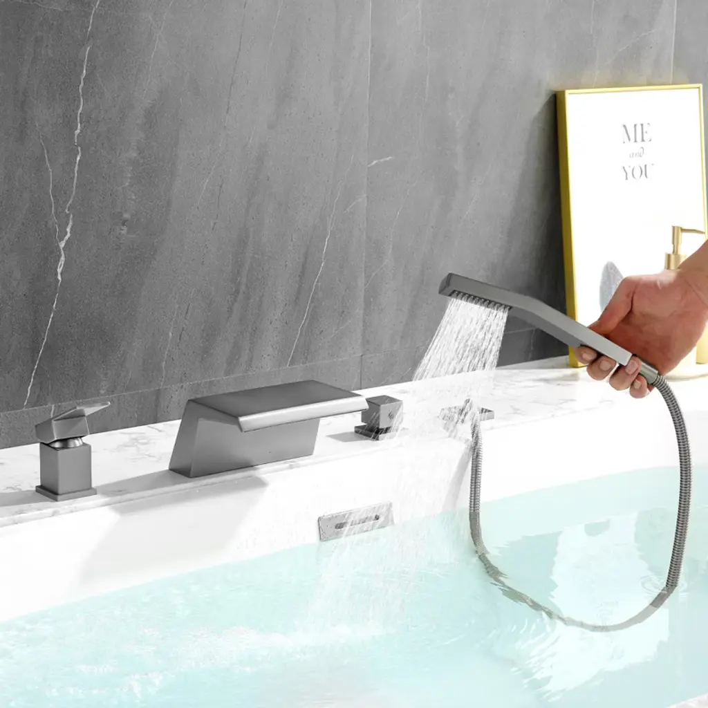 This bathtub faucet adopts an elegant and fashionable design style, which is able to adapt to a wide range of bathroom environments with bathtubs and naturally blend with common bathroom fixtures and decorative styles.Meanwhile, it is mainly made of brass and stainless steel, which is durable, not easy to rust and fade, prolonging the service life of the product, and combining aesthetics and practicality. The bathtub shower faucet set comes with handheld shower, bathtub faucet and 5 hoses.The bathtub faucet is designed with a 7.09-inch wide waterfall spout, the spout action is as neat as a waterfall, bringing you a stable water flow experience.The hand shower comes with a 59-inch hose with gravity ball, and the longer hose length effectively extends the shower's range of motion.At the same time, when the shower is finished, the gravity ball guides the hose back into place with its own gravity, keeping your bathroom clean and tidy, and providing you with a convenient and efficient experience. This shower faucet set adopts simple single-lever control, which is intuitive and convenient to operate, and can easily realize water flow adjustment.In addition, it is also cleverly equipped with a diverter knob, which can be switched between the bathtub faucet and the handheld shower with just a gentle turn.Whether you are immersed in the gentle embrace of the bathtub or enjoying the pleasure of the hand shower, it can be easily realized, creating an efficient and comfortable bathing environment for you, allowing the body and mind to get the ultimate relaxation under the caress of the water. This product adopts 4-hole installation method, reasonable layout is convenient for daily shower use. We have a professional after-sales team ready to provide you with support to ensure peace of mind.