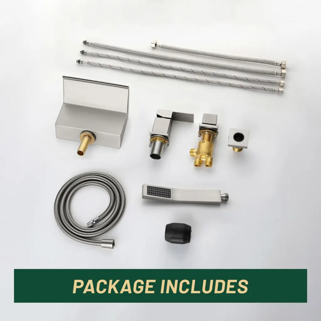 Cobbe Brushed Nickel Waterfall Bath Faucet Set With 7.09-inch Wide Tub Spout And Hand Shower Single Lever Control 4-hole Installation