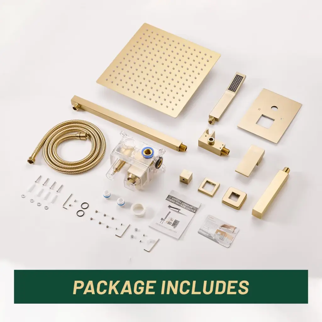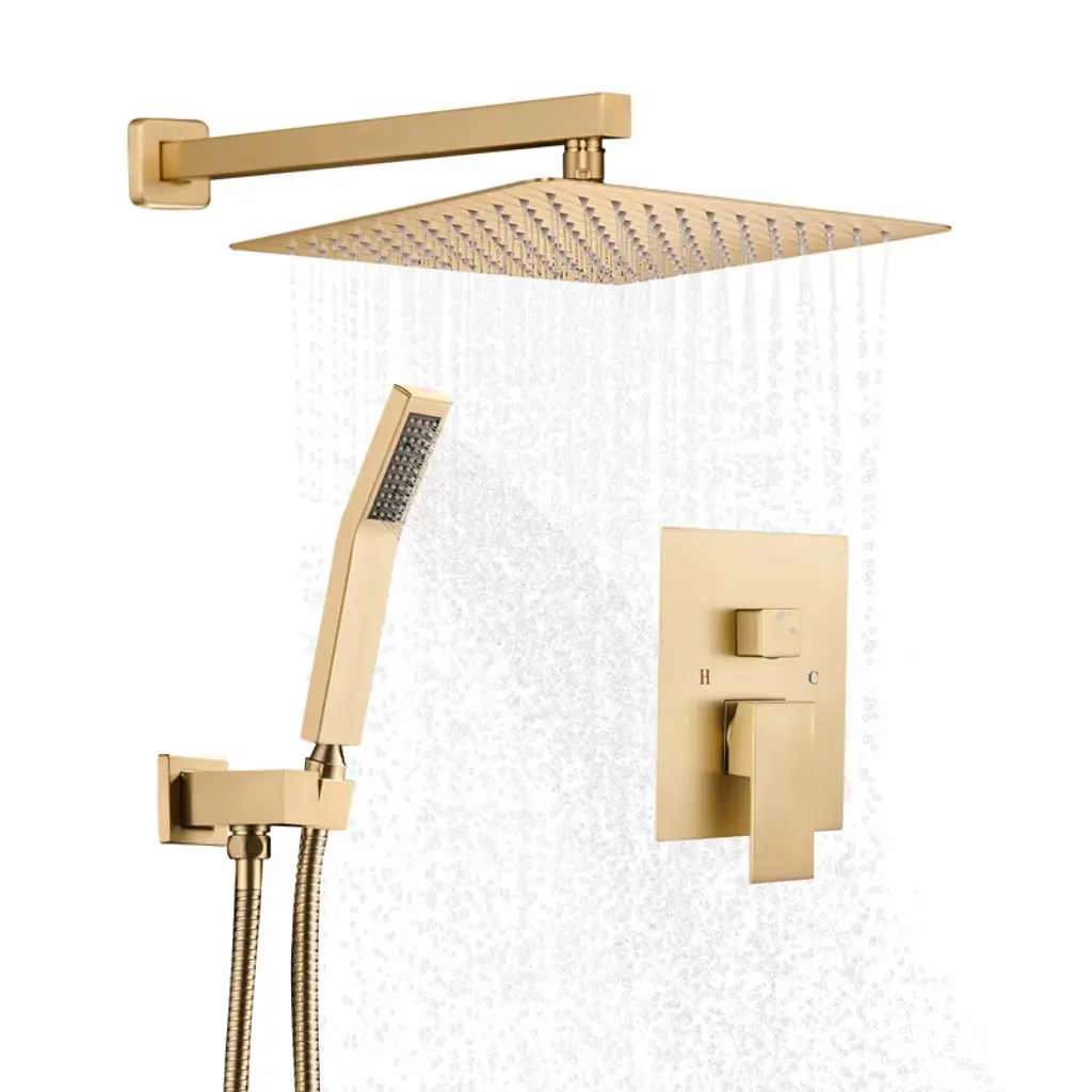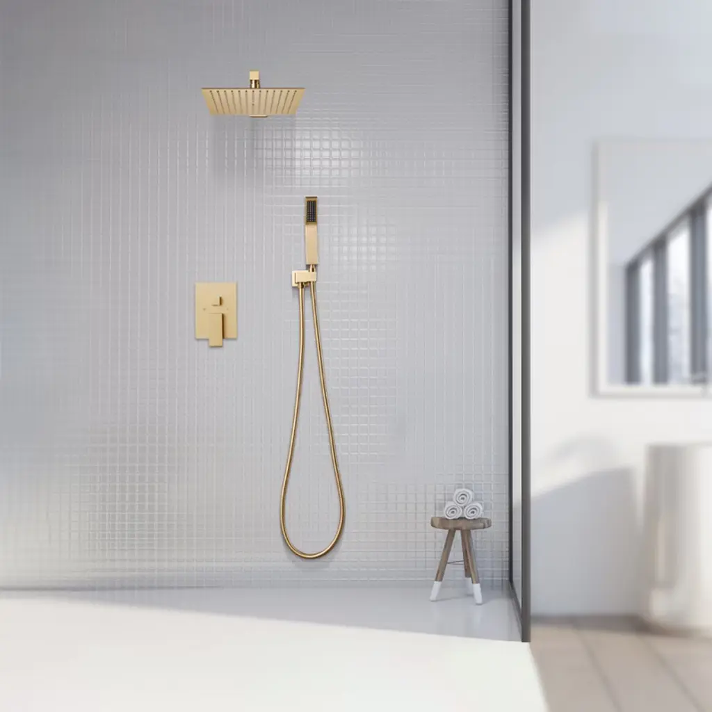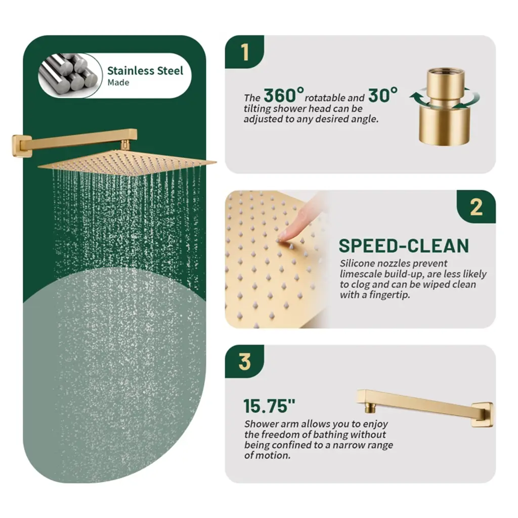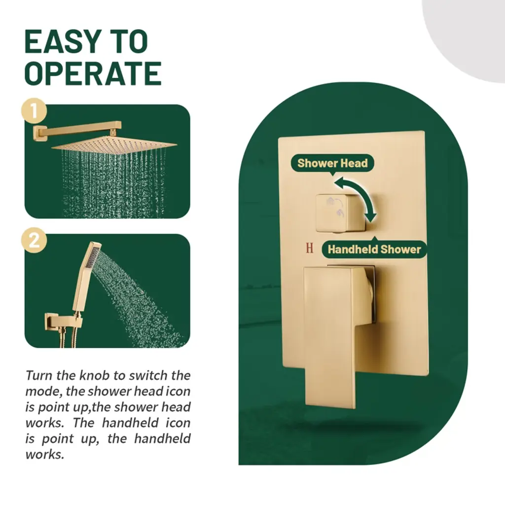 Special treatment of the product surface ensures corrosion resistance and durability. Thanks to the shower head's ultra-thin 2 mm design, High-pressure technology offers a consistent powerful rain shower even under low water pressure. If you don't have a large shower area but want a shower system with a rainfall experience, this is the perfect product. The 10-inch overhead rainfall showerhead allows for the installation of a shower system in tight bathroom spaces. All-metal robust construction makes the shower system strong and durable, with the square rainfall shower head and handle shower made from high quality 304 stainless steel and the rough-in valve made from solid brass. If you want to switch spray modes, just turn the knob for one-handed operation. The rainfall shower head icon on the knob faces upwards, use the rainfall shower head alone. The handle shower icon on the knob faces upwards, for use with the handle shower alone. The pressure balance valve's cartridge monitors water pressure balance, helping to protect you from being scalded by sudden changes in hot or cold water pressure. Rational layout of the spout so that the water flow is evenly distributed throughout the nozzle.You will enjoy a spa-like shower just like in a soothing downpour.Moreover,you can adjust it to any desired angle. 70.8-inch hose reaches into the corner of your bathroom to eliminate cleaning blind spots or to bathe your children or pets. The handheld stand used to hold it is also adjustable in angle. Transform your shower experience with our modern shower system that boasts a sleek appearance, adaptable to any bathroom style. Get peace of mind with our two-year warranty and installation instructions, ensuring a hassle-free experience.