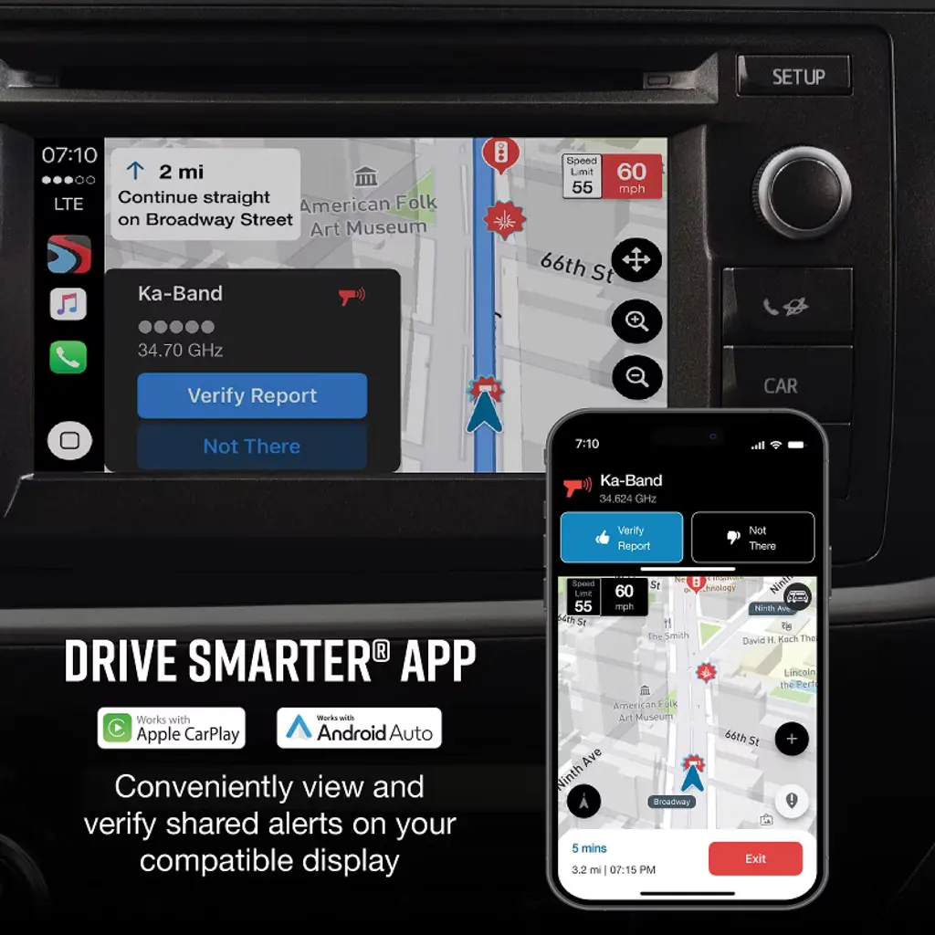 The Cobra RAD 480i Radar/Laser Detector with Bluetooth is a high-performance driver alert system designed to defy road threats with exclusive technology to help you drive smarter and safer. There's advanced tech for longer range detection and accurate alerts. The part of its connected car software technology includes updateable software to improve performance. And iRadar app integration lets you share and receive real time alerts from the Cobra driving community, like real-time speed trap alerts! Plus you'll be able to access the nationwide database of red light and speed cameras.