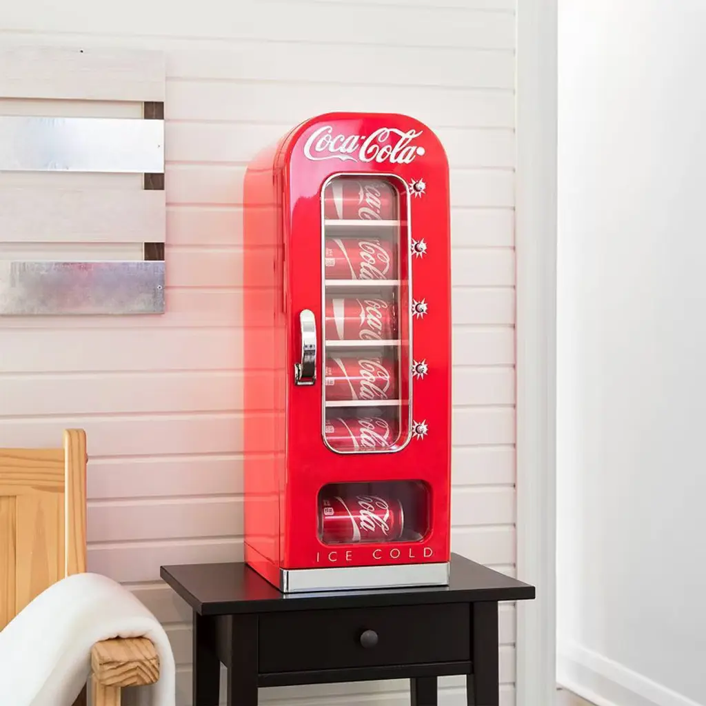 Keep your favorite soft drinks cool in unique retro style! With its quirky retro vending machine design, this eye-catching AC/DC powered Coca-Cola themed mini fridge is sure to be a conversation starter. Slim and compact at only 9.5 inches (24.1 cm wide), it holds 10 standard soda cans and features a built-in display window and push button "vending" action that is sure to delight your guests.
