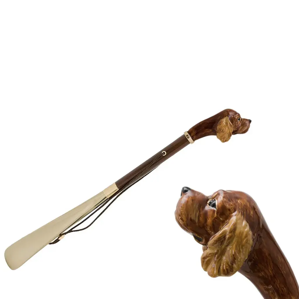 Featuring an enameled brass handle representing the head of a cocker spaniel, the Cocker Shoehorn is a delightful and classic style accessory. With a wooden shaft and ABS end, it is 50 cm in length and is entirely handmade in Italy.