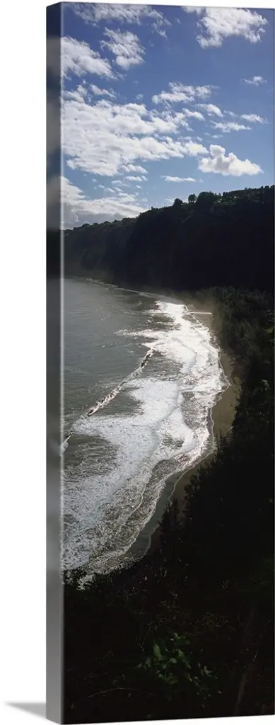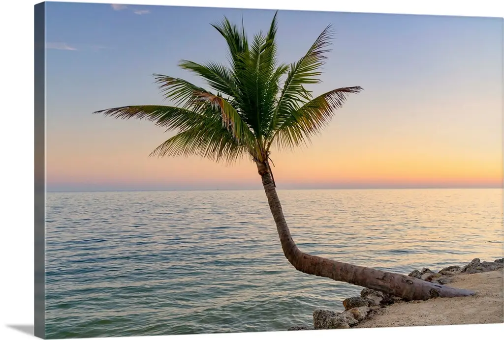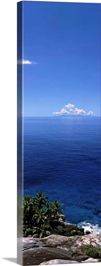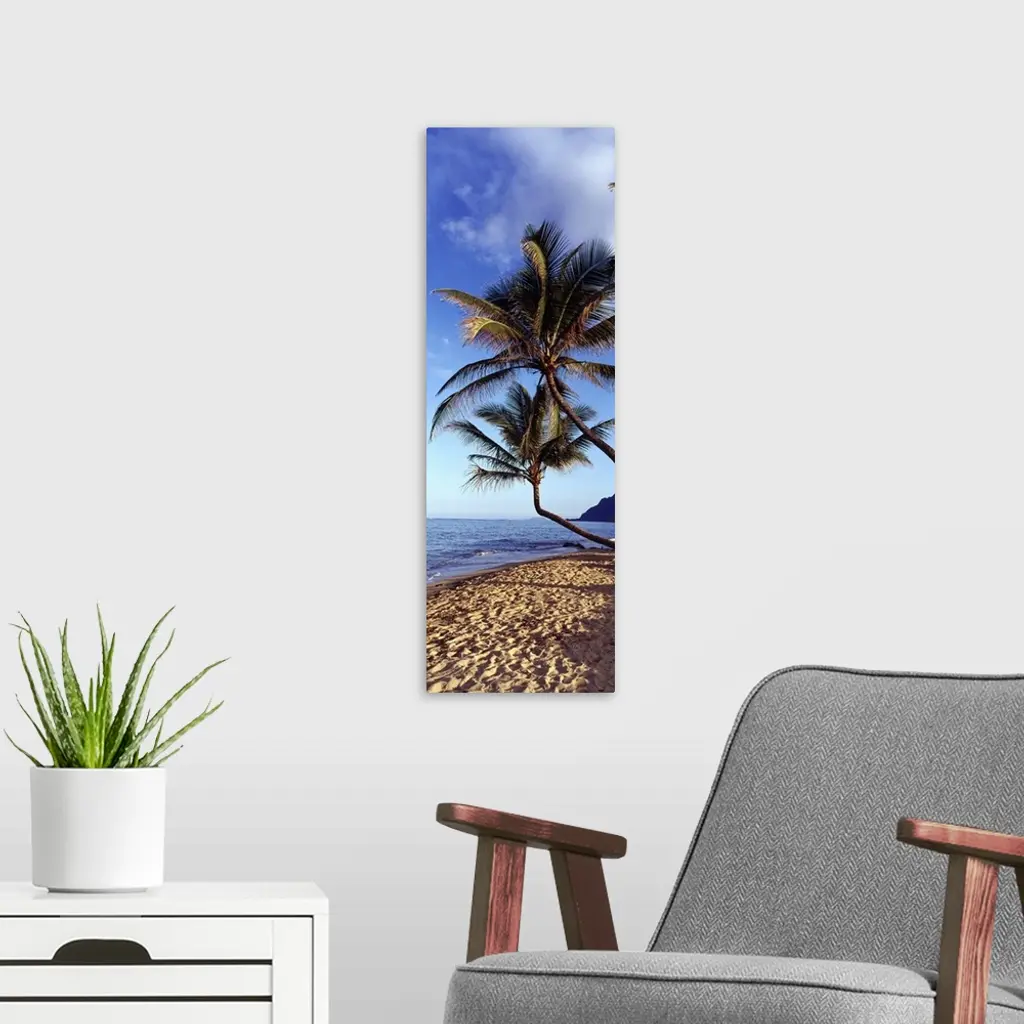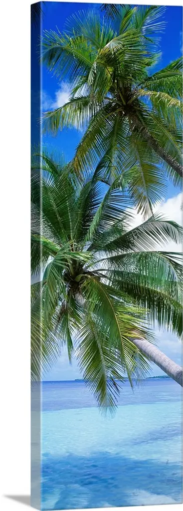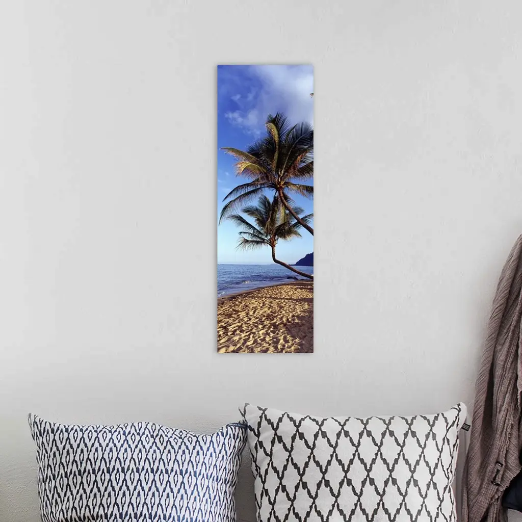 Vertical panoramic image of crooked palm trees sticking out over a sandy beach on a clear day.
