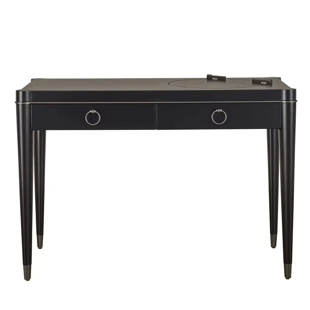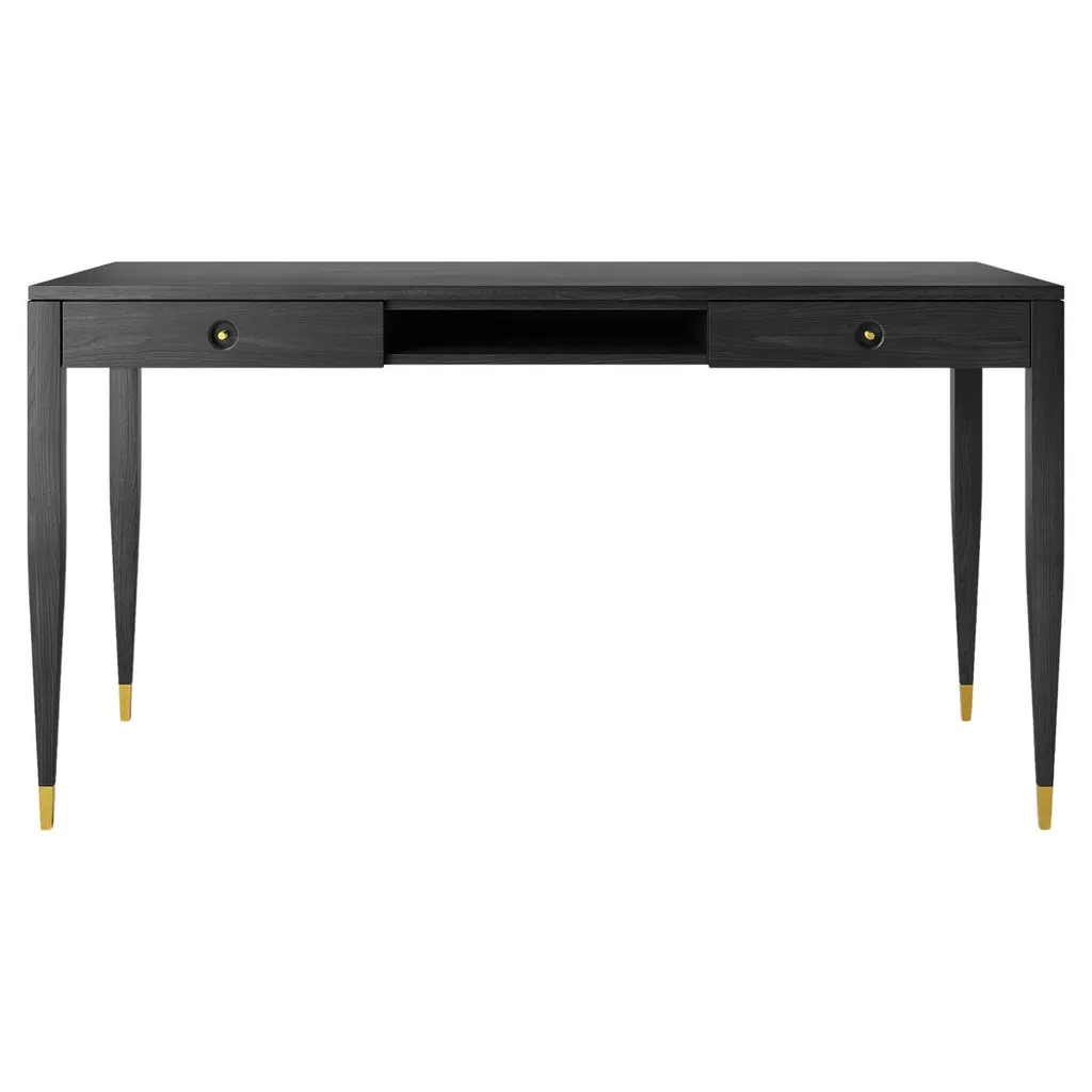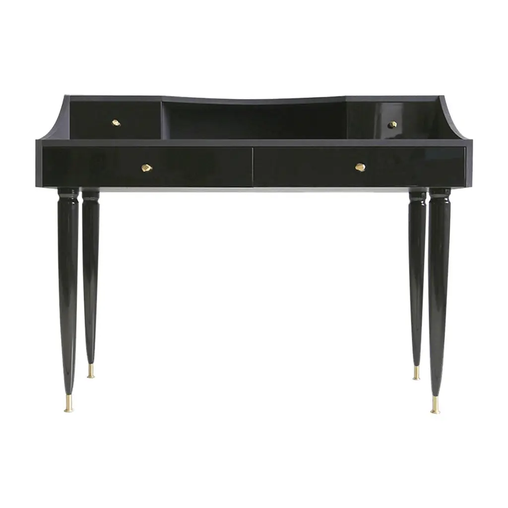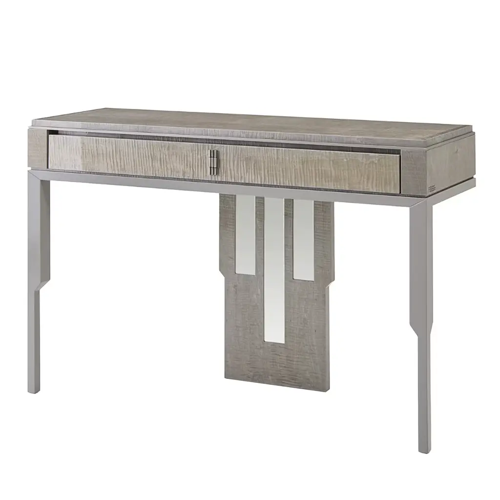Striking in its simplicity, this refined console and mirror set will be a mesmerizing statement in an entryway. Supported by conical feet accented with brass-finished metal ferules, the rectangular unit is framed with inlaid veneered wood in an elegant shade of gray. Two large drawers made of beige lacquered wood with fluted shafts, velvet-like finish, and leather handles complete this piece, creating a visually contrasting effect that is modern and versatile. The large mirror (110 x 110 cm) features a beige lacquered wood frame with rounded corners accented with small inlays on each side.