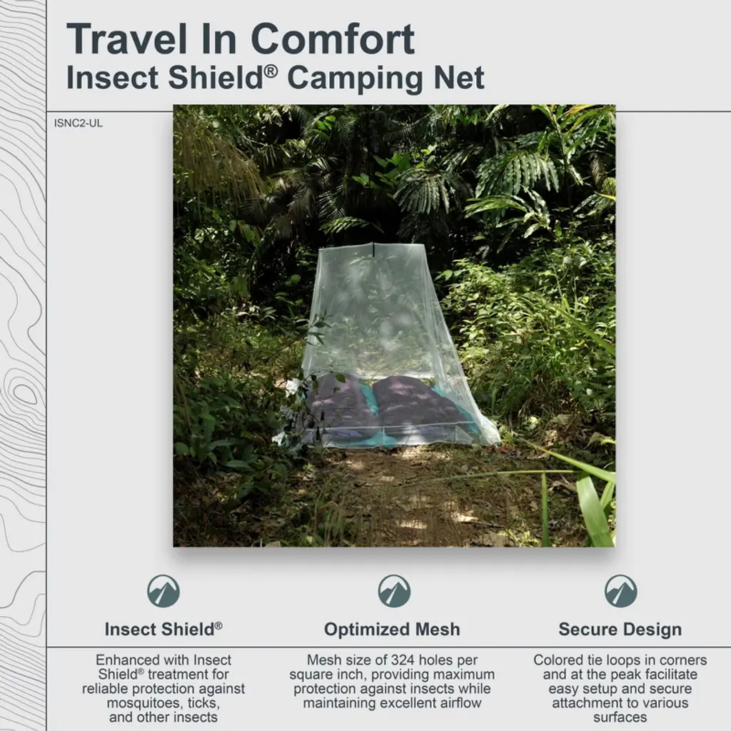 The Ultralight Double Camping Net is perfect for the minimalist backpacker. This netting is made from 15-denier nylon mesh and is designed to be ultralight and compact. This double-sided netting provides ample space for two people and their gear and at just 8.8 oz., this net will barely add any weight or bulk to your pack. Keep the bugs at bay and enjoy a peaceful night's sleep in nature with this double-person camping net. Additionally, the built-in Insect Shield protects you from mosquitos, ticks, and other pests.