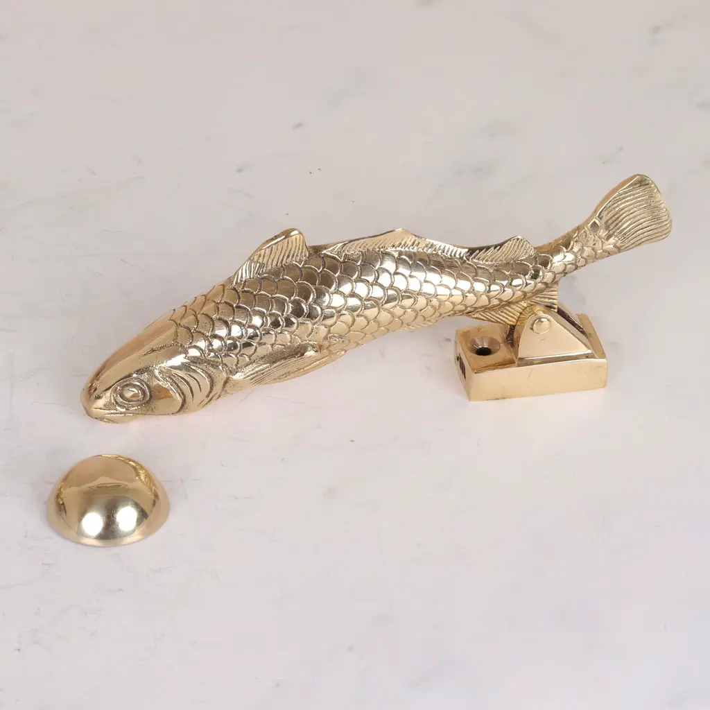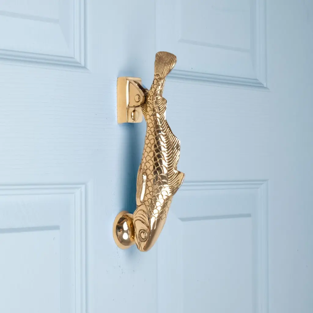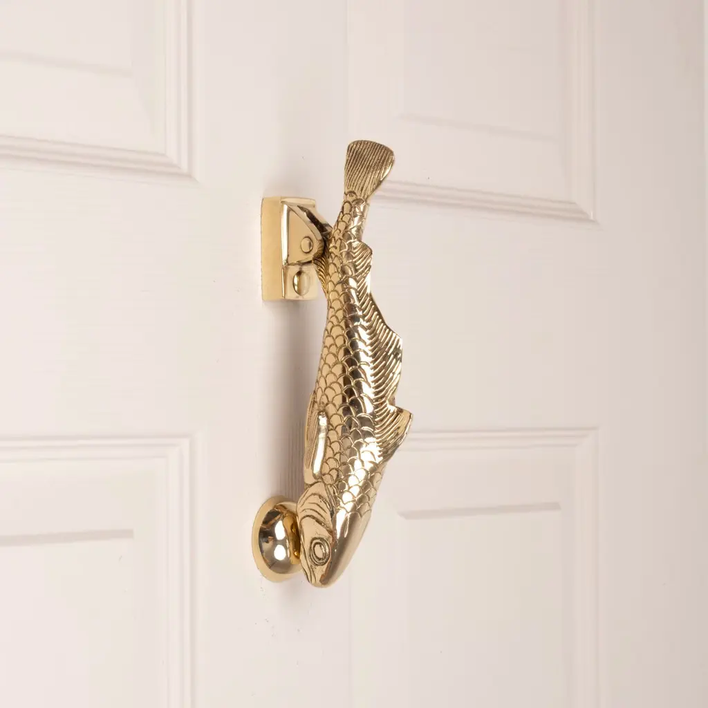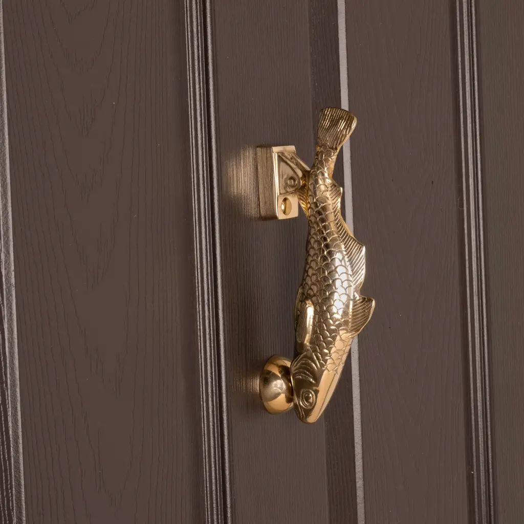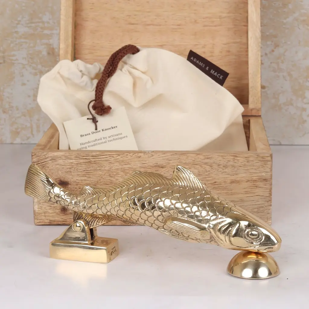 Inspired by the natural movement of a swimming cod, this solid brass cod door knocker features a gentle curve through the body and intricate detailing in the scales and fins. Weighing over half a kilo, it delivers a strong, satisfying knock. A decorative yet functional piece, it’s ideal for coastal homes or anyone with a love of the sea. Each door knocker is handcrafted using traditional techniques and engraved with the maker’s mark. Fixings included. Presented in a wooden gift box with a branded dust bag. Other finishes available—see our website for details.