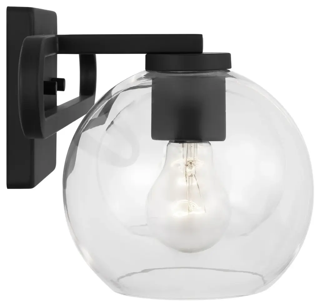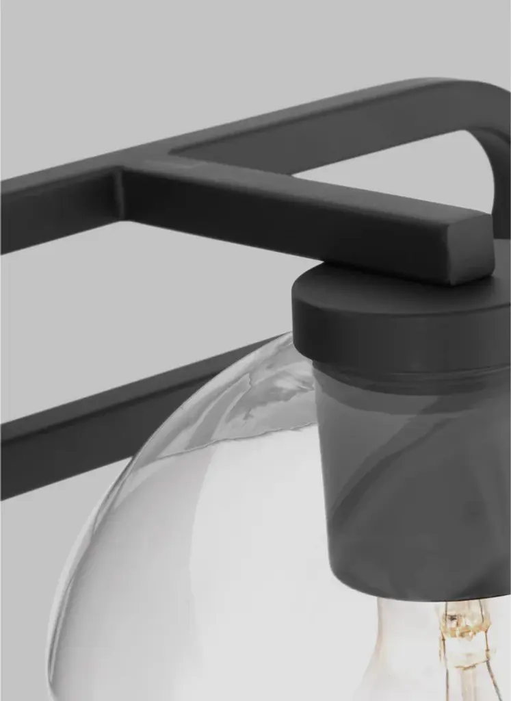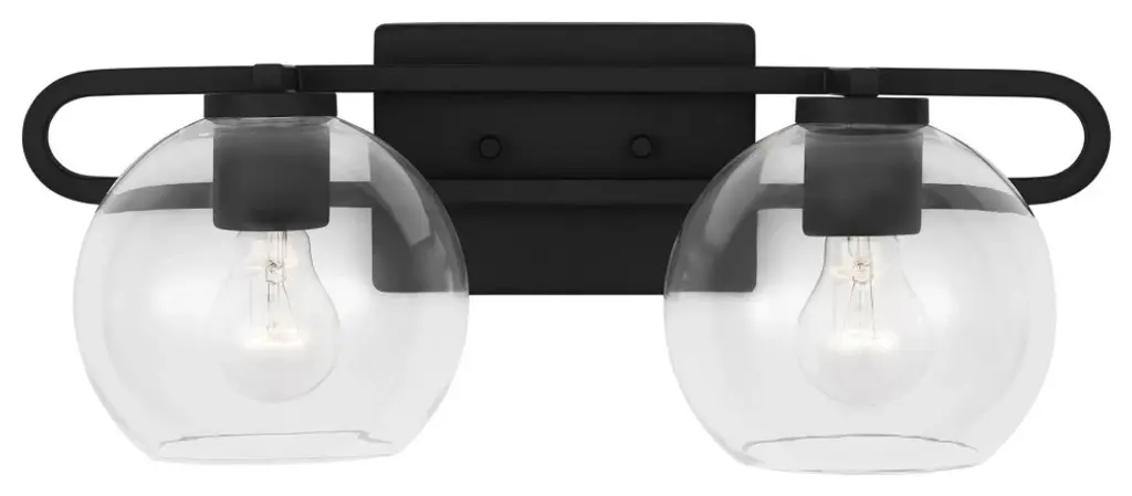 The Codyn two light vanity fixture in Midnight Black is a contemporary take on a classic mid-century design. Clear glass shades with open-ended spheres accent the elongated keyhole strap detail, for a clean look. This minimalist collection relies on subtle details to create visual interestFrom the brand formerly known as Generation Lighting LightingMinimalist mid-century damp rated fixture for powder room and bathroom applicationsAll hardware included for easy installation as fixture can be mounted in the up or down positionUses (2) 60-watt medium base light bulbs sold separatelyNumber of Bulbs: 2Bulb Type: A19Bulb Wattage: 75Bulbs Included: No