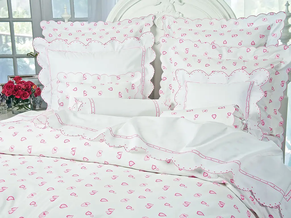 Precious hearts weave a magical spell on this 300 thread count Egyptian cotton damask with a sensuously silky feel. Pink, Blue or Green hearts create a subtle 'bio-colore' effect, helping you drift into a more romantic setting than you thought possible.
