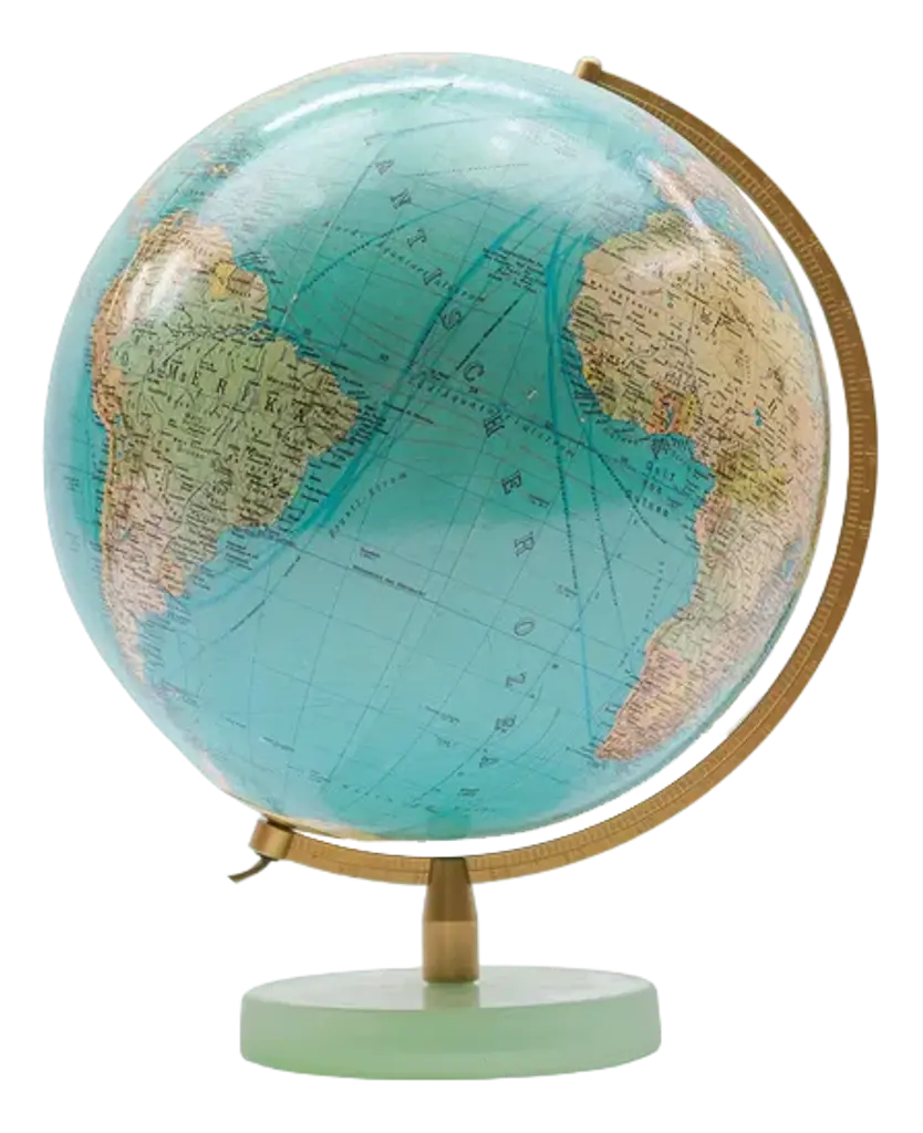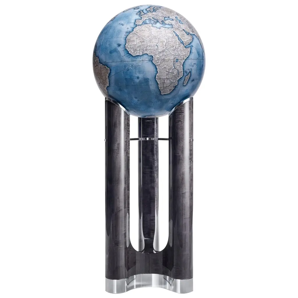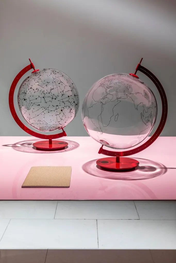 Gio Tirotto realizes the project Coexist: the Ground globe and the Sky stellar map, two objects complementary as only Sky and Earth can be, where the transparent glass allows to look to the world and the stars in their entirety, overlapping far places close in the blink of an eye, underlining both their symmetries and differences. Gio Tirotto challenges the geographic logic through these objects in which distances are nullified and infinite point of view coexist creating a whole new imaginary. The Coexist Ground Glass World Map Globe invites observers to explore far-off places and the stars in a single glance. A perfect addition to contemporary interiors, it merges artistry and functionality with exceptional style. Handmade in Italy in handblown glass, complemented by a striking red iron base.Items sold separately. Also available in Natural Iron and Black Iron.Kindly be advised that should production occur during the months of August and December, extended delivery times may apply.