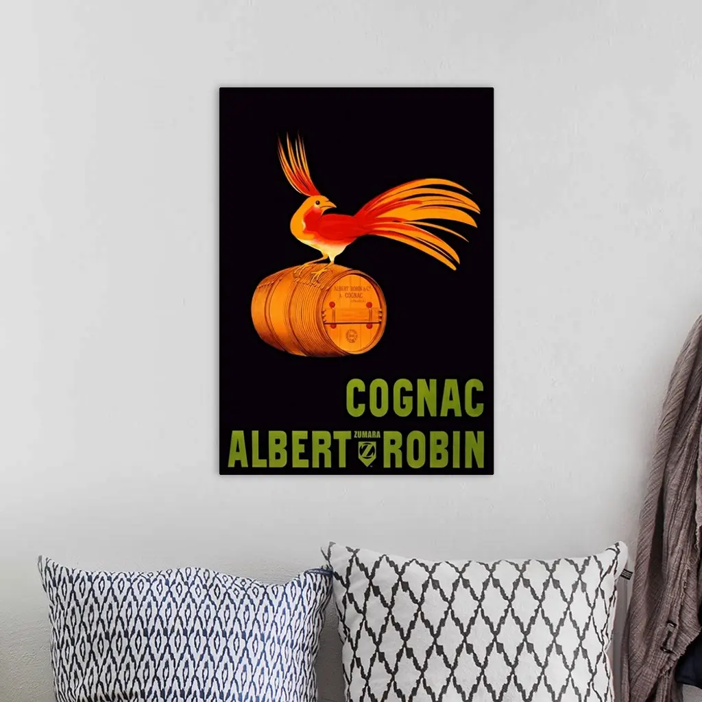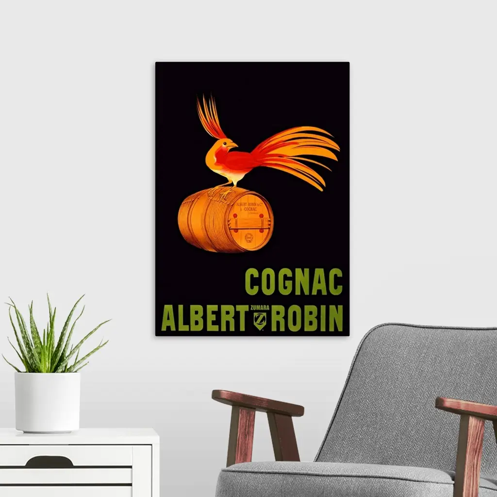 Large vertical vintage advertisement for Albert Robin Cognac, with a bright bird with long plumage, perched upon a wooden barrel, on a solid black background.