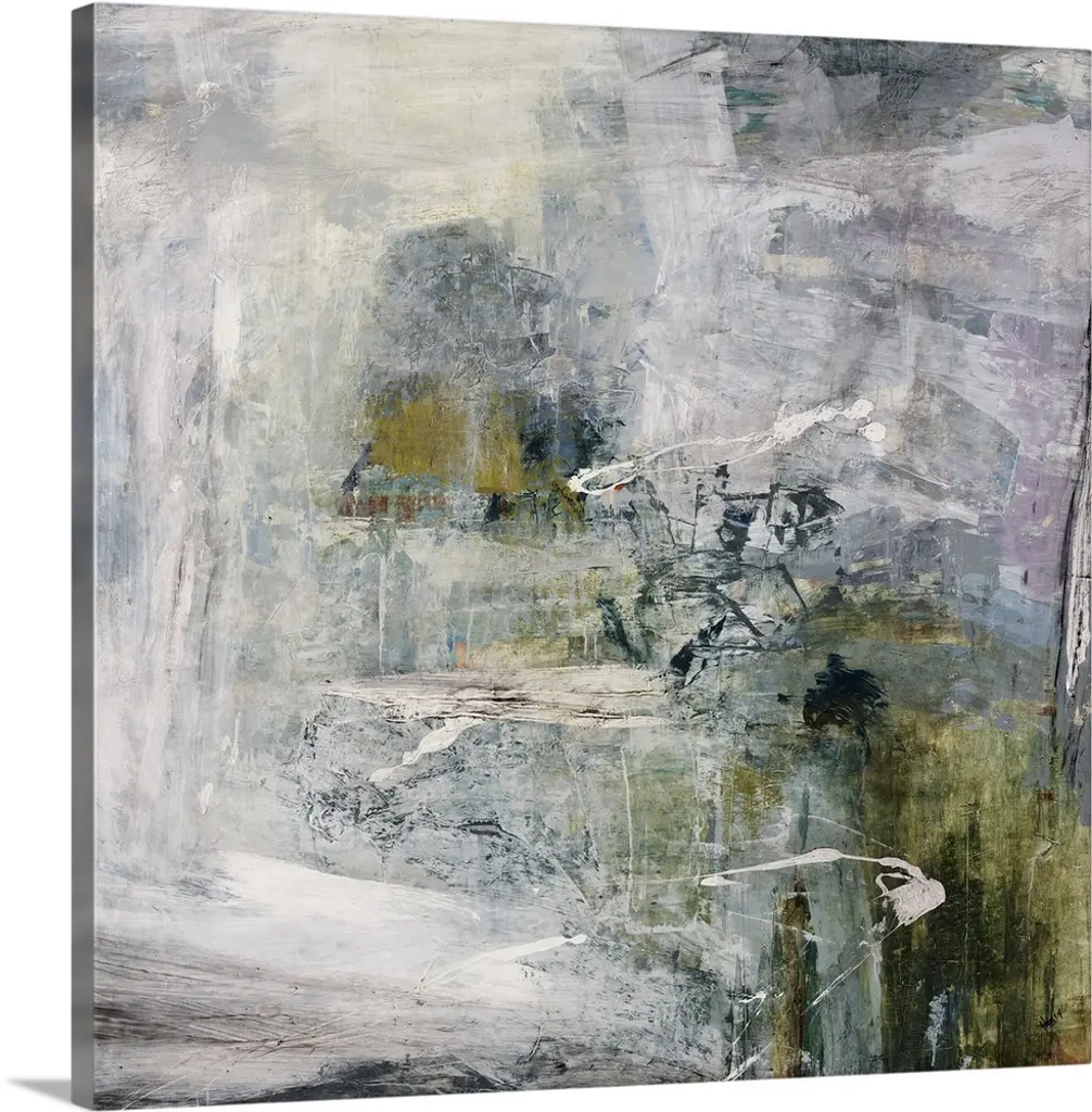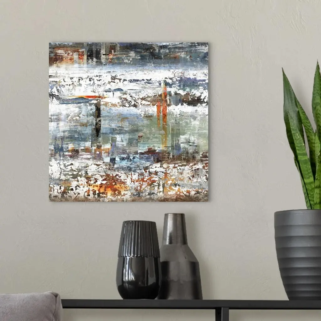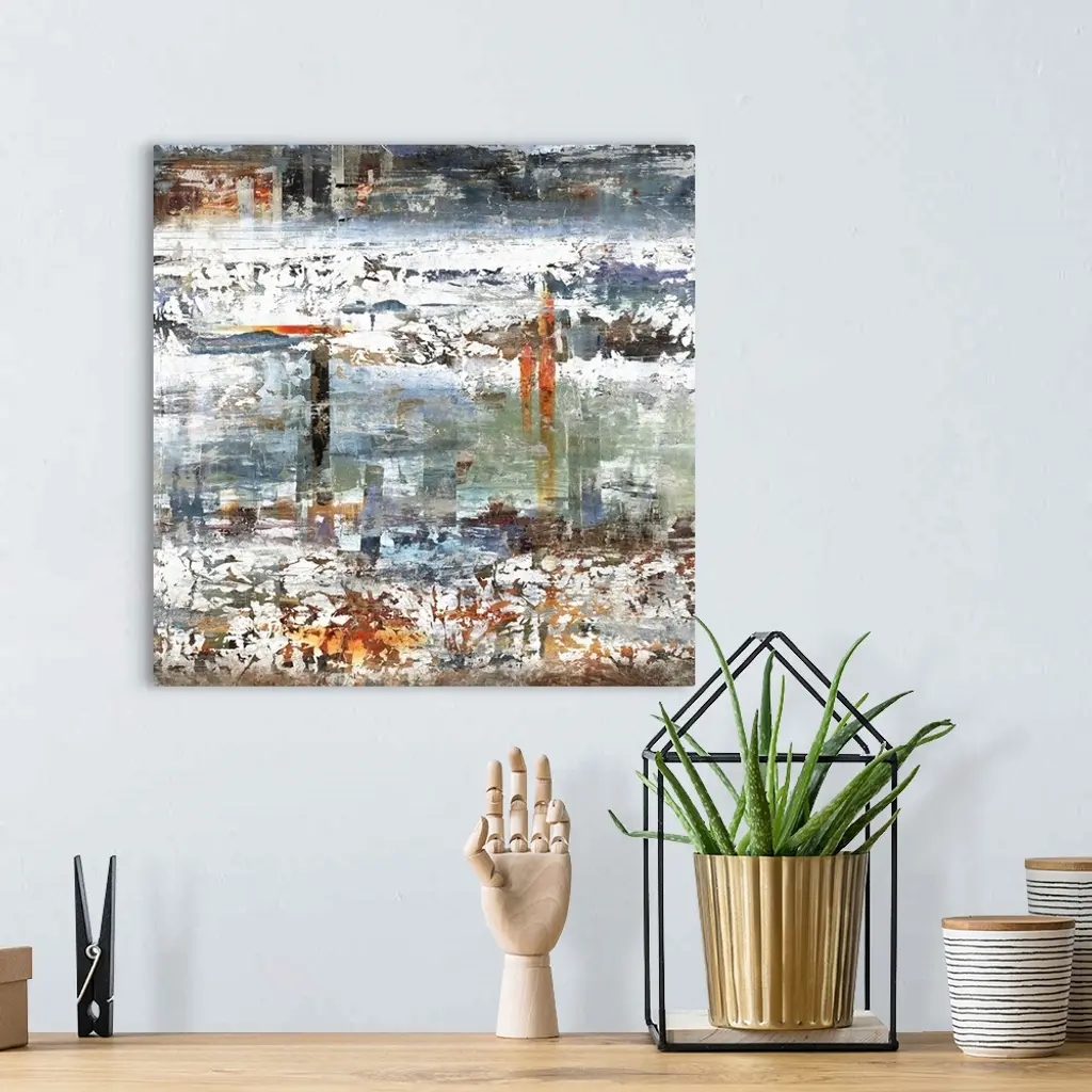 Square abstract art with a balance of both cool and warm tones and thick, white, choppy bands running horizontally across the canvas.