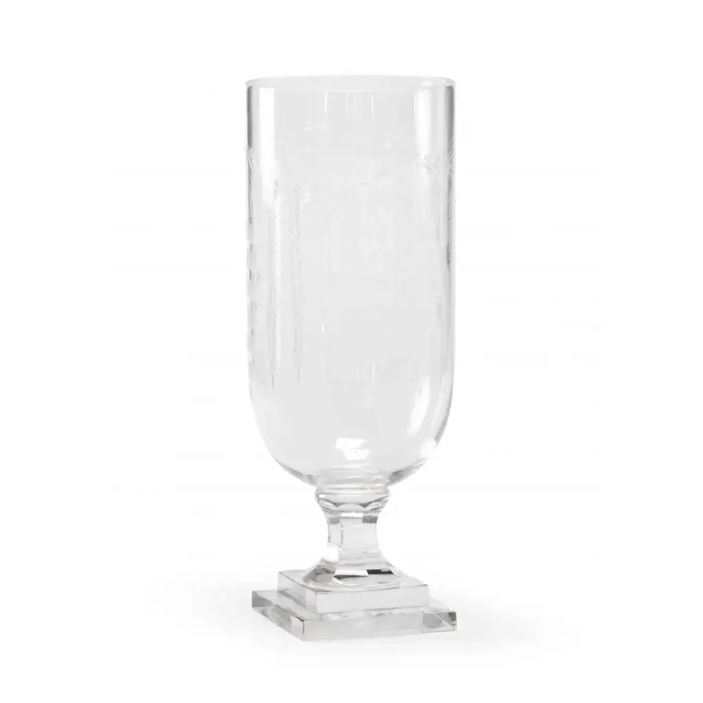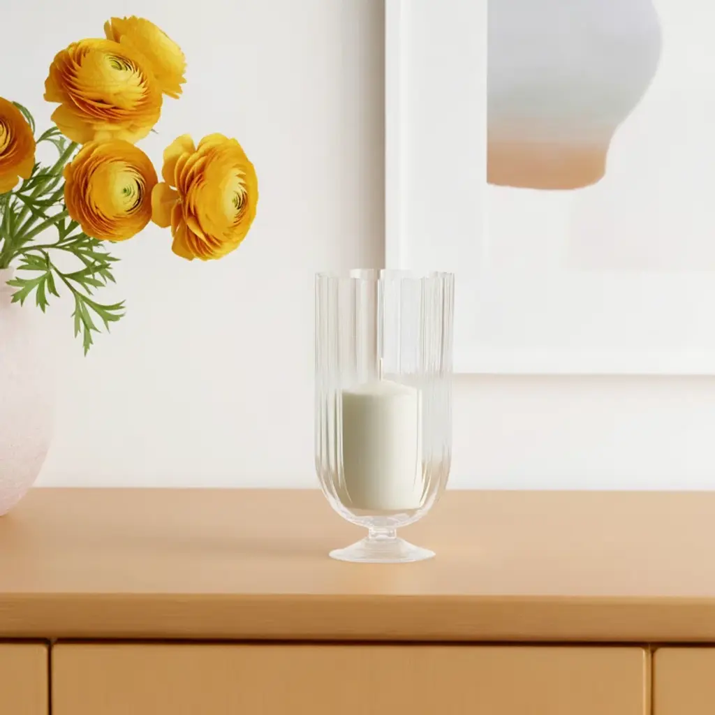 The clear candle holder is perfect for enhancing the beauty of your living room coffee table or mantle, to create a warm and inviting aesthetic. Designed with felt or rubber stoppers at the base that prevent scratching furniture and table tops, as well as sliding around. Can hold 1 wax candle, candle is not included. This item ships in 1 carton. This glass candle holder makes a great gift for any occasion. Suitable for indoor use only. This item ships fully assembled in one piece. Made in India. This is a single clear-colored hurricane candle holder. Modern style.