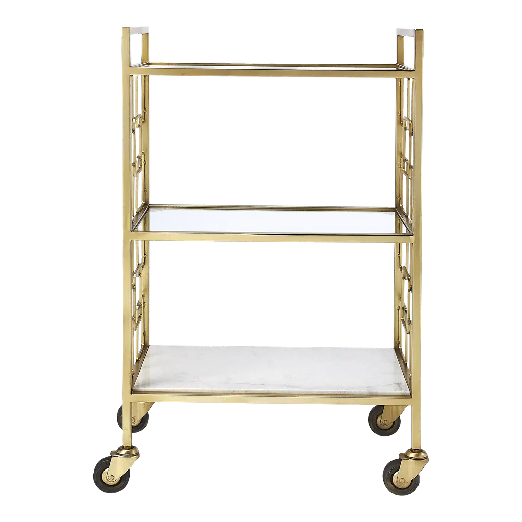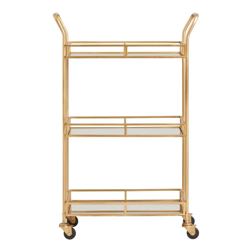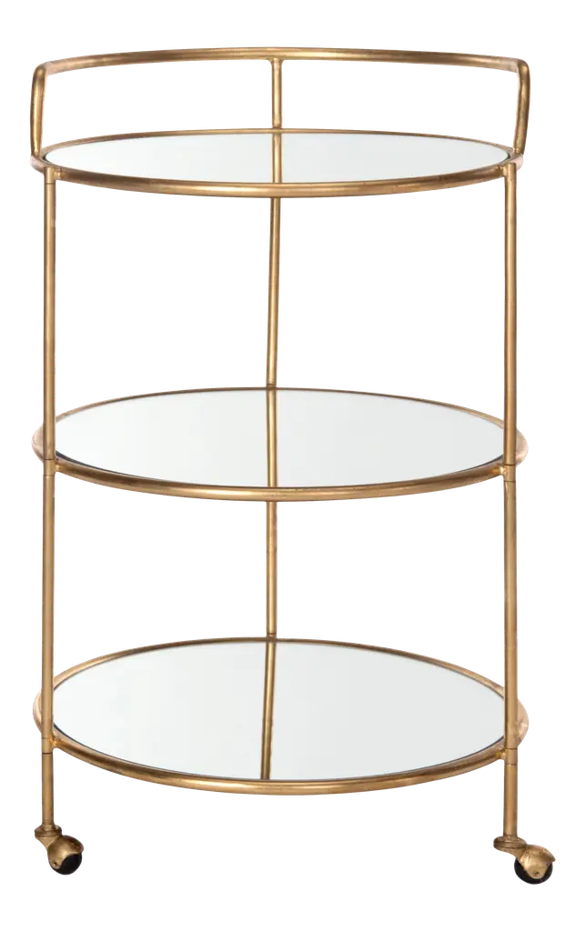 Serve drinks in style with the Cole three-tier bar cart featuring mirrored-glass trays and a sleek metal frame with an antique-brass finish. This portable, four-wheel home bar is perfect for parties, moving easily from one room into another. The lowest shelf easily holds liquor bottles and wine and the middle tier can handle all of your backup glasses, leaving the top tier open for open for master mixology.