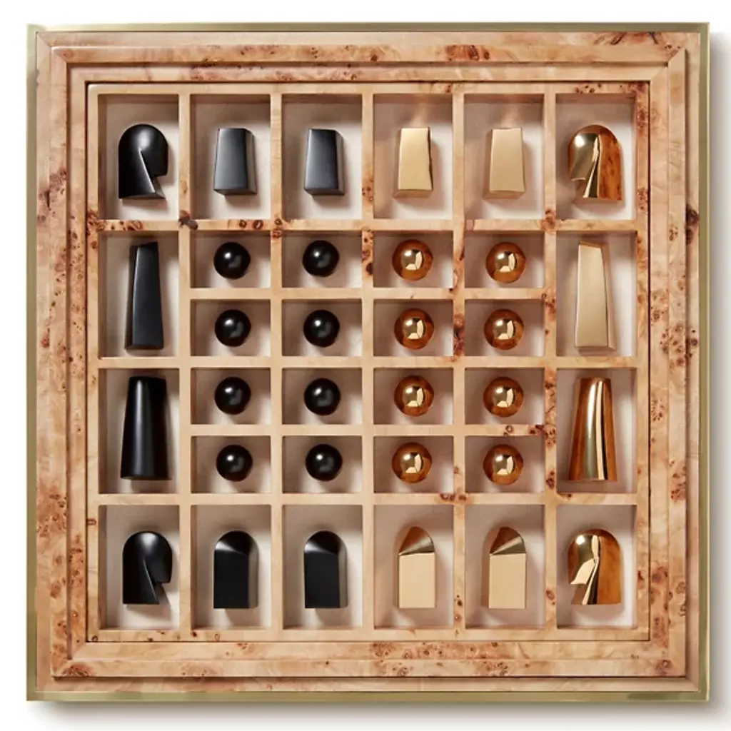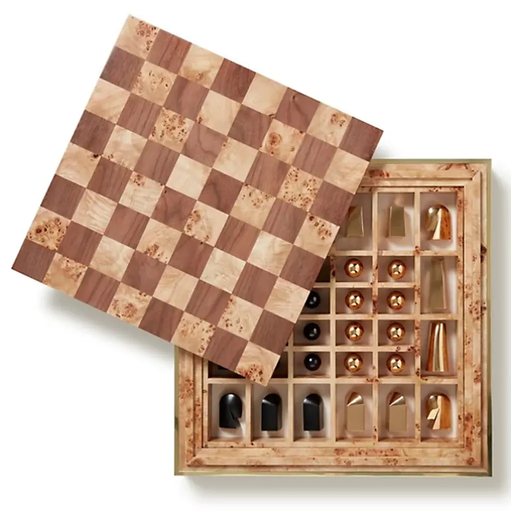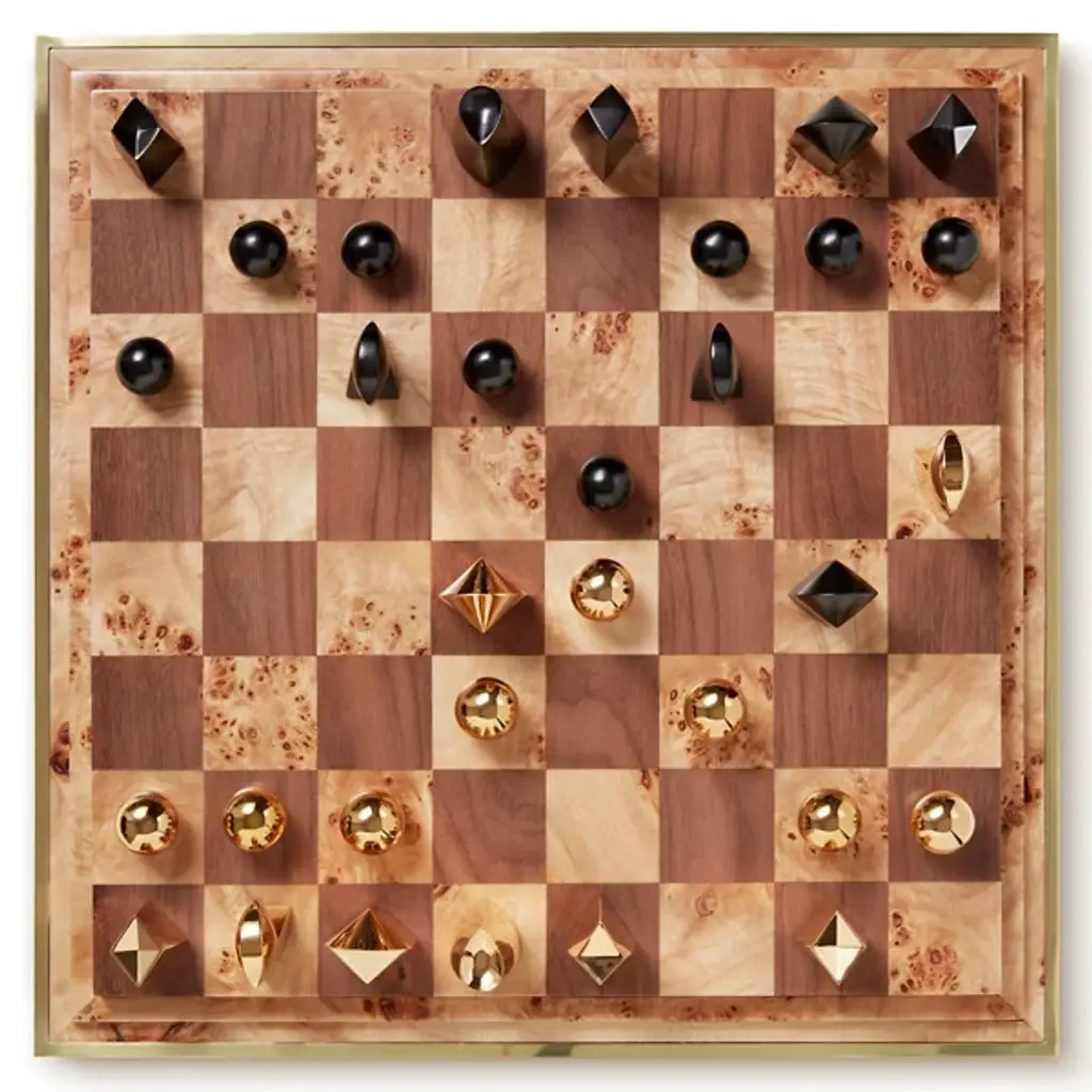 The Colette Cane Chess Set from AERIN draws inspiration from 1970s bamboo and raffia designs while incorporating modern geometric chess pieces. The woven cane case features brass accents that complement the game pieces housed within. Each chess piece displays geometric forms that update traditional shapes for current tastes. This combination of natural woven materials with metal details creates a game set that bridges decades of design influence while ensuring durability for regular play and serving as an heirloom piece for future generations.