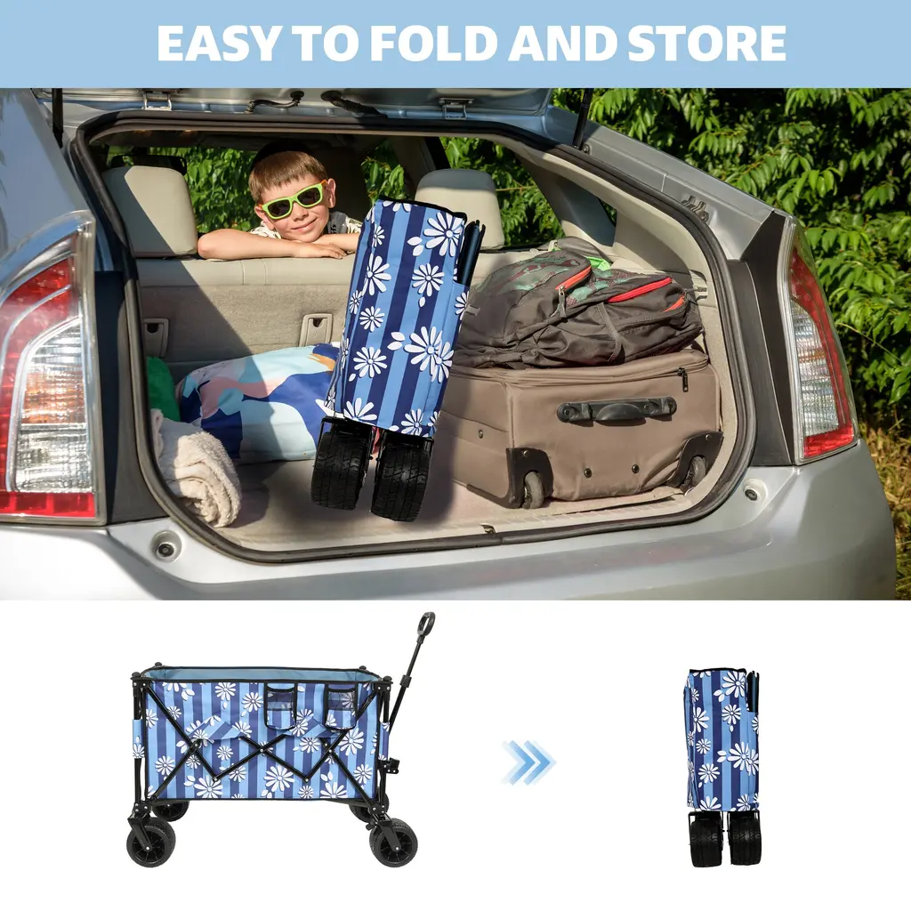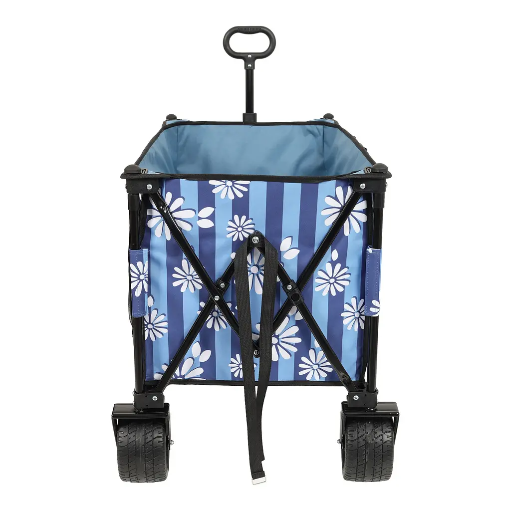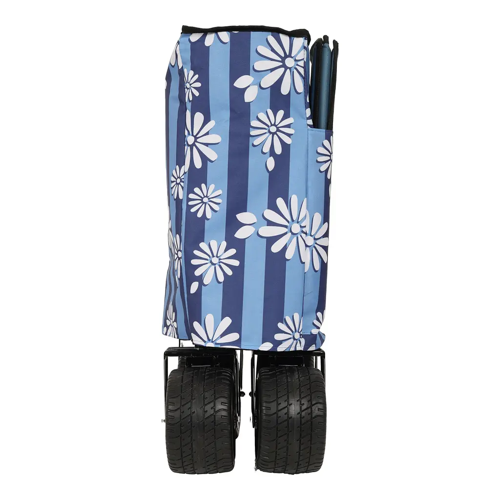 Large Capacity – 150L, Adjustable Handle, Compact Fold Size, Load Up to 480lbs, Super Large 7"x4" Wheels,drink holdersSidepocket with refelctor strip for ipad and books,Umbrella Pocket included, removable canopy ,black with mosquito net.The frame of the folding cart is made of high quality steel for reliability and durability.Capable of carrying camping gear, garden gardening items, sundries and other items.And it can free up space on both sides for pulling longer and wider loads.
