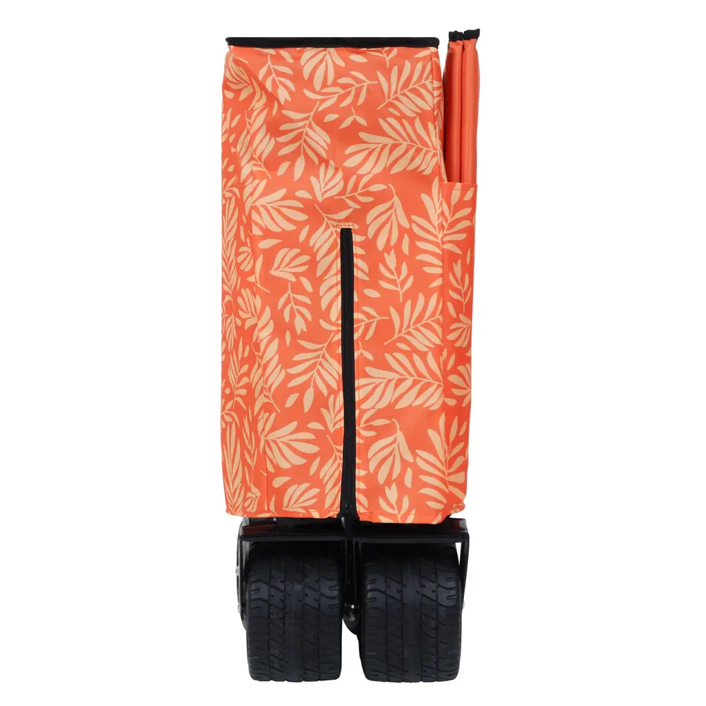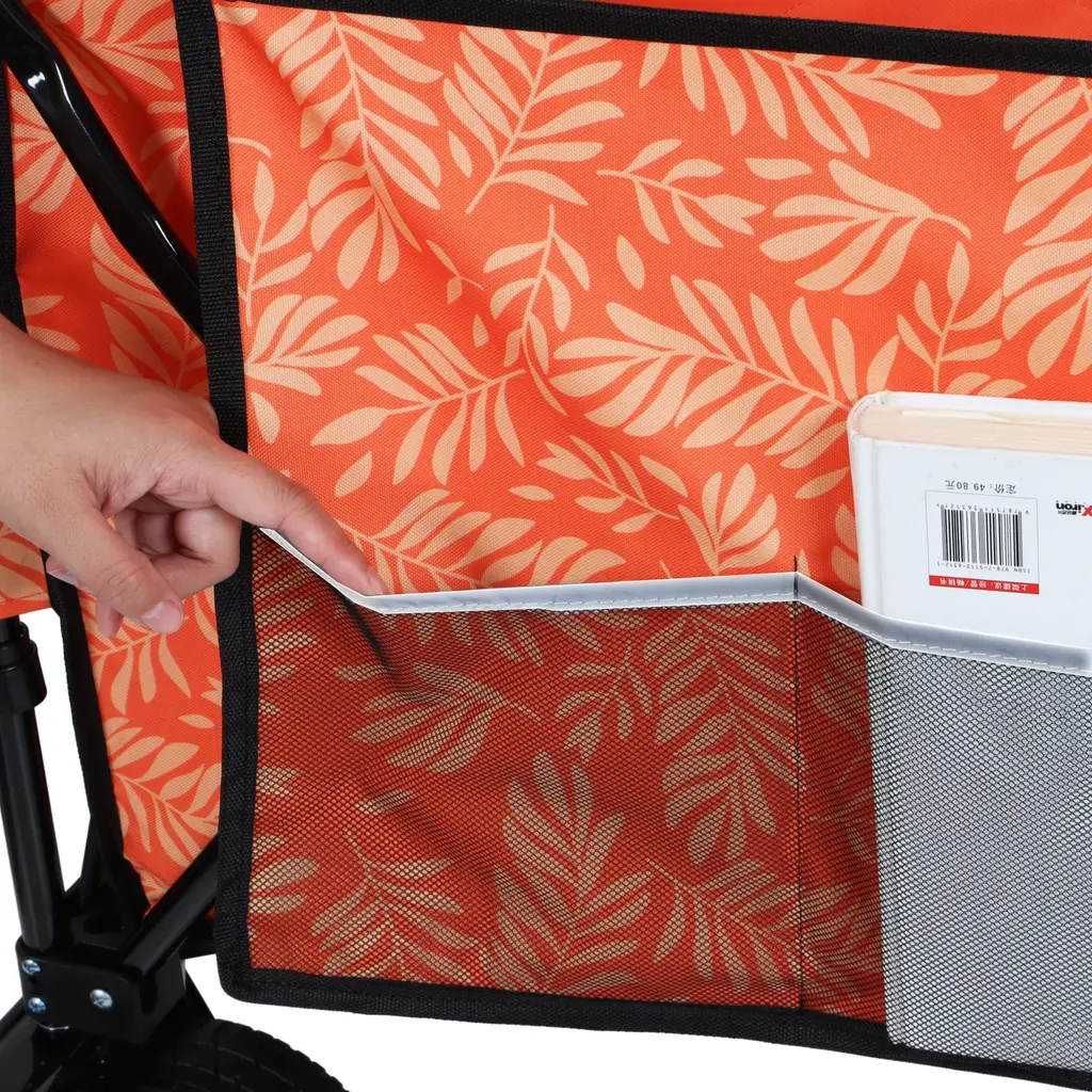 Large Capacity – 150L, Adjustable Handle, Compact Fold Size, Load Up to 480lbs, Super Large 7"x4" Wheels,drink holdersSidepocket with refelctor strip for ipad and books,Umbrella Pocket included, removable canopy ,black with mosquito net.The frame of the folding cart is made of high quality steel for reliability and durability.Capable of carrying camping gear, garden gardening items, sundries and other items.And it can free up space on both sides for pulling longer and wider loads.