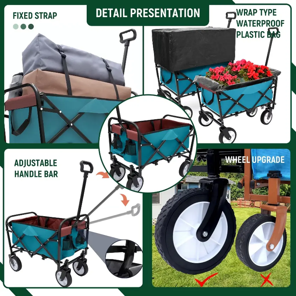 Collapsible Foldable Wagon Cart Beach Wagon Heavy Duty Utility Cart For For Camping With 3Pcs Plastic Liner Bag Cyan