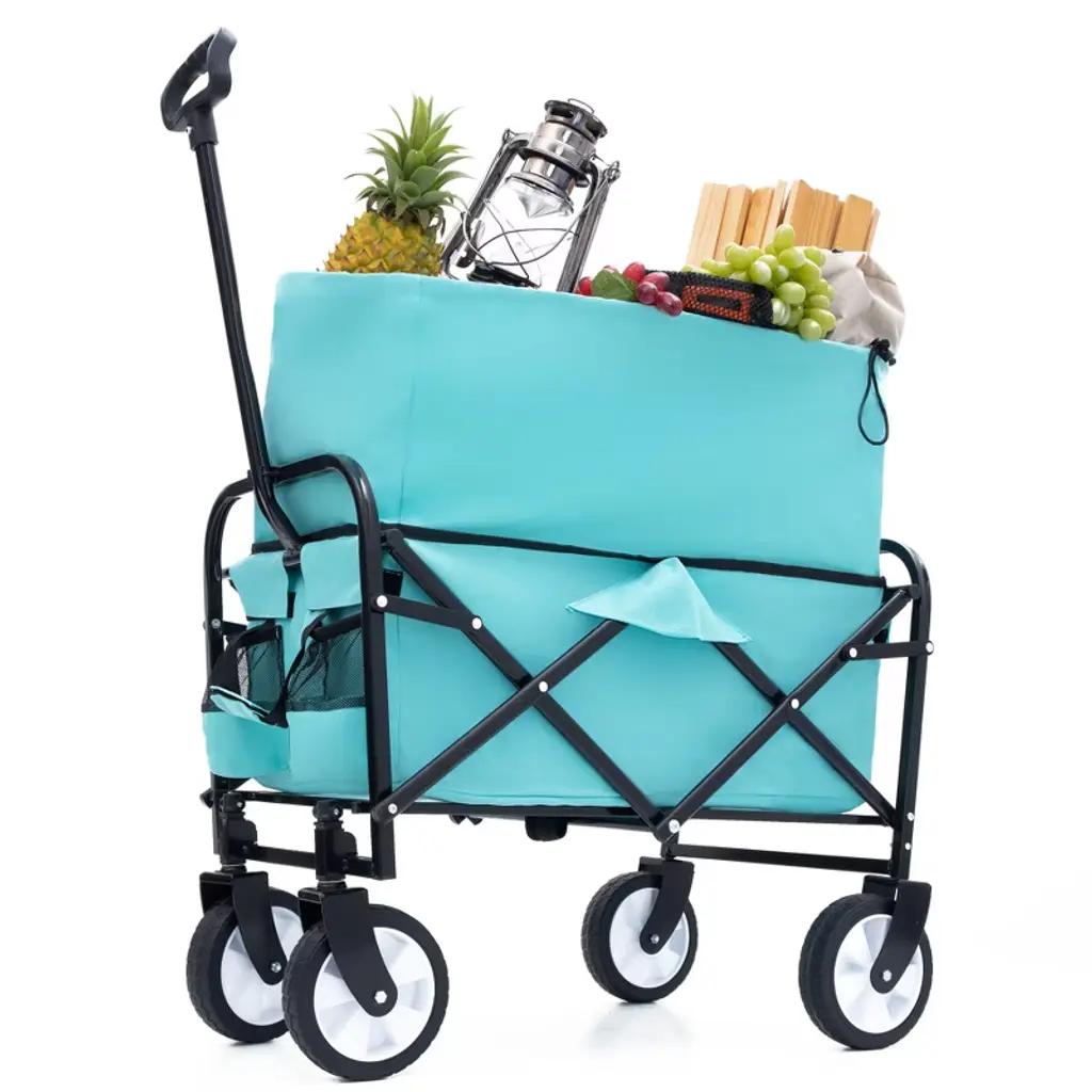 This collapsible wagon with canopy can support up to 220lbs and can store up to 140L of space; There is also an Ice pack frame, double cup pockets, and lined pockets on the inside of the wagon, suitable for storing all kinds of itemsThe wagon cart has removable canopy; The canopy keeps rain and dust out and the items inside the wagon from getting wet; It can be easily removed when not neededThis wagon is adapted with thick wheels, which can adapt to all-terrain and have stronger driving power than thin wheels; With brakes for timely braking downhill or when neededThe overall frame of the folding wagon is made of steel, which is a very load-bearing style; The canopy and wagon are made of double-layer oxford cloth, which can resist tearing and durableThe pull handle of the wagon can be adjusted in height and angle, which is convenient to move the wagon; The push handle can also be adjusted up and down, you can push the wagon with the angle that suits you