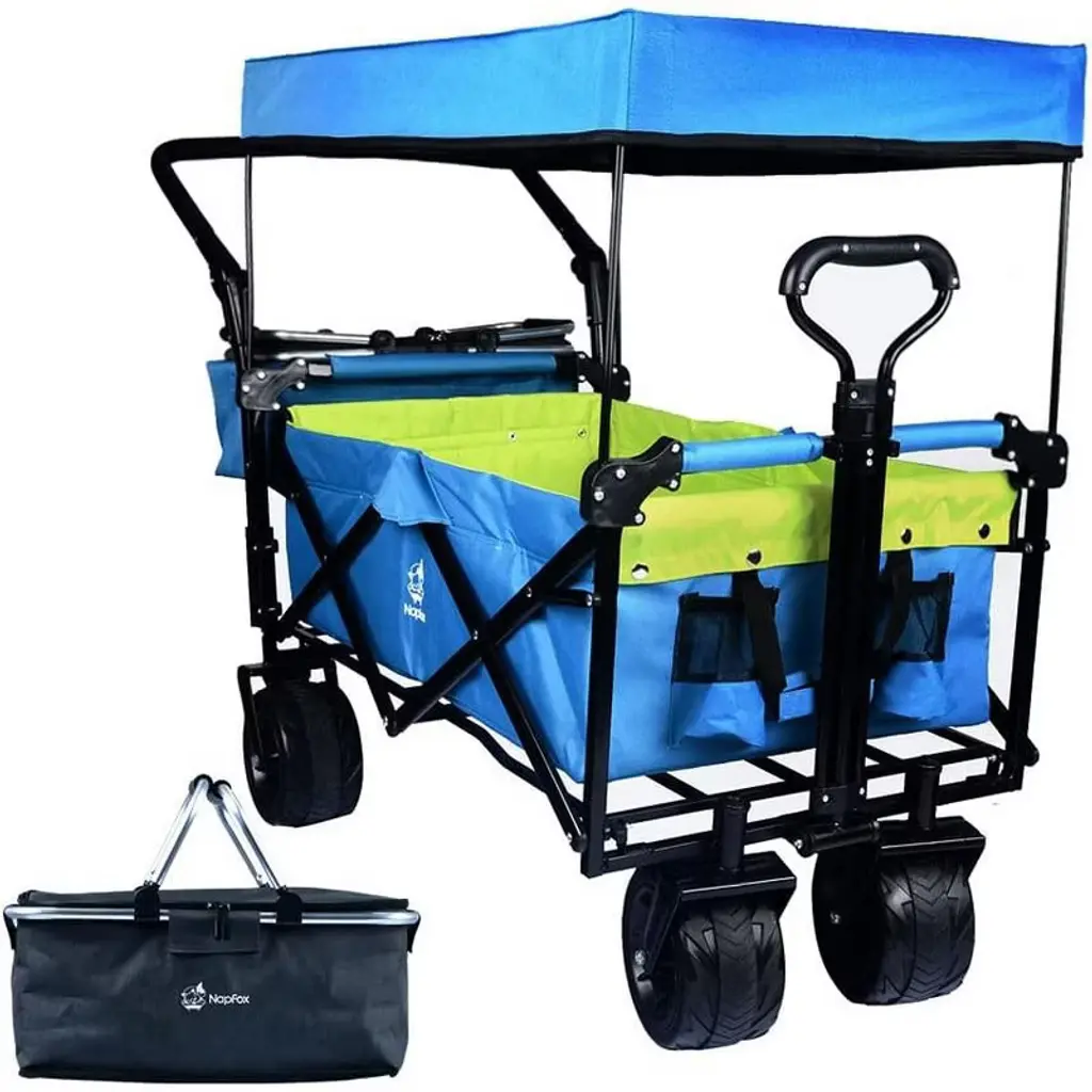 This collapsible wagon with canopy can support up to 220lbs and can store up to 140L of space; There is also an Ice pack frame, double cup pockets, and lined pockets on the inside of the wagon, suitable for storing all kinds of itemsThe wagon cart has removable canopy; The canopy keeps rain and dust out and the items inside the wagon from getting wet; It can be easily removed when not neededThis wagon is adapted with thick wheels, which can adapt to all-terrain and have stronger driving power than thin wheels; With brakes for timely braking downhill or when neededThe overall frame of the folding wagon is made of steel, which is a very load-bearing style; The canopy and wagon are made of double-layer oxford cloth, which can resist tearing and durableThe pull handle of the wagon can be adjusted in height and angle, which is convenient to move the wagon; The push handle can also be adjusted up and down, you can push the wagon with the angle that suits you