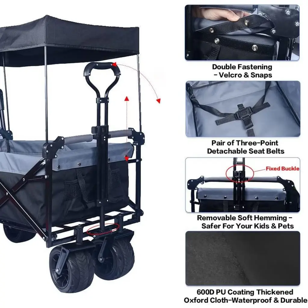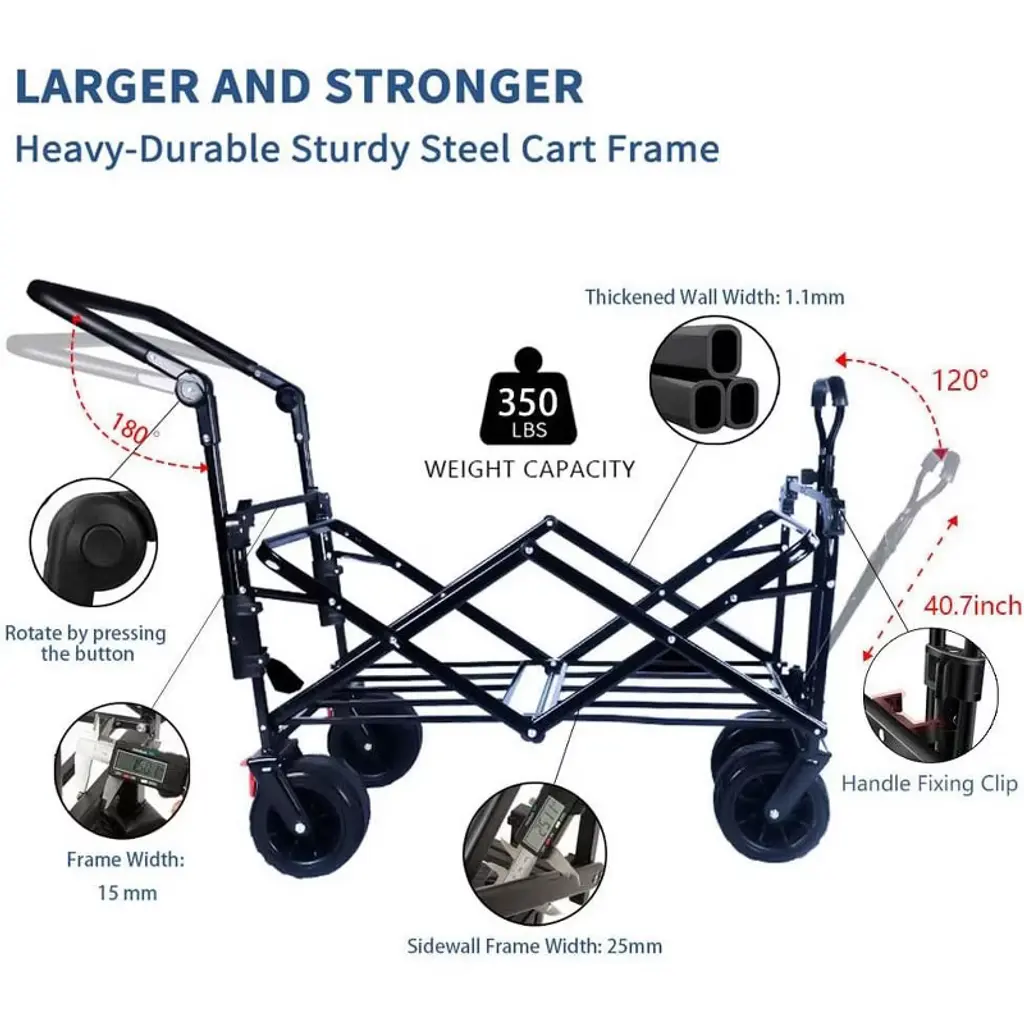 A Pair of Feet On The Brakes This wagon cart has a pair of foot brakes for extra safety when you are pulling heavy objects or your kids & pets. Brake or start with just a light pedal stroke. Provides convenience for your travel. Reasonable Storage Space The grocery cart provides an extra storage basket, two mesh bags and a pair of three-point safety straps, convenient for sorting and placing different kinds of items. Push & Pull Handle The wagon cart can be pushed and pulled at the same time, making it easier to traverse obstacles such as slopes. 360¡ãRotating Front Wheels 4"wide x 7"diameter Large wheels with anti-skid tires. Suitable for various roads such as beaches, ramps, stones, lawns, steps etc. Easy To Carry This wagon cart can be folded into a small size, you can pull it away like a suitcase. The best porter for outdoor travel, supermarket shopping, courtyard work and transportation etc. Telescopic Handle With Fixed Lock The pull rod of this wagon cart can be stretched to a maximum of 40.7". This adjustable handle also has a fixed lock, so you can adjust the length of the handle according to your needs.
