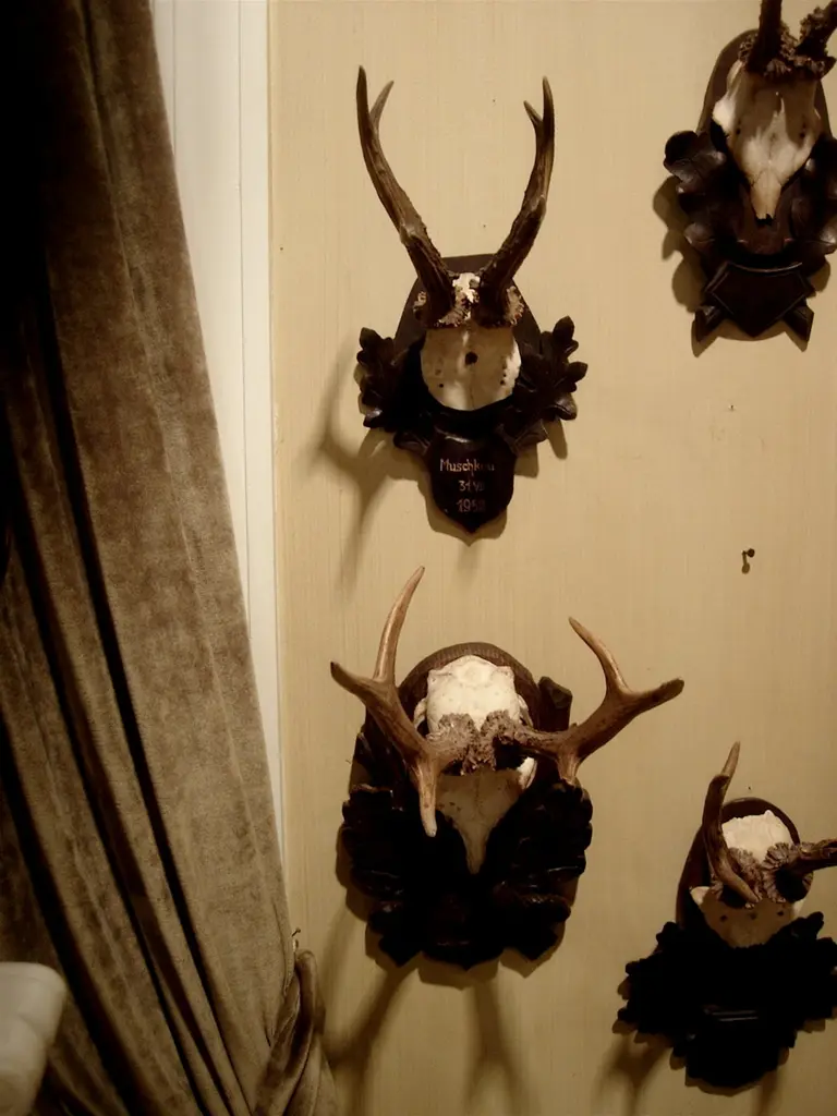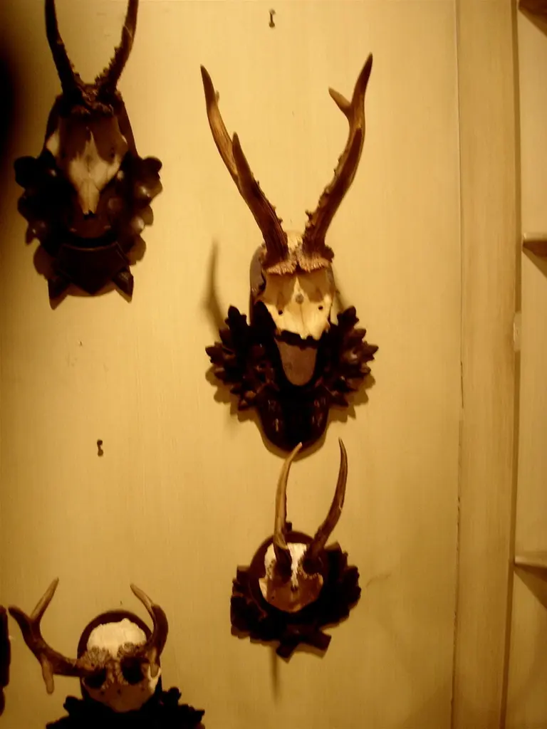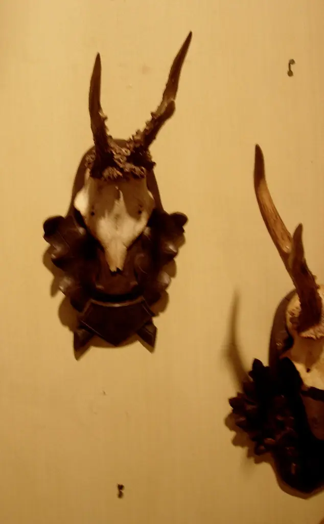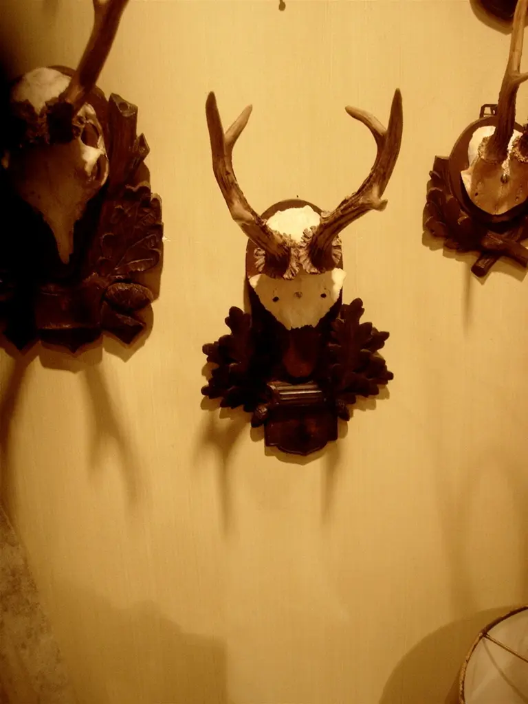 Collection of five Black Forest roe mounts on carved wood plaques. Priced per mount.
