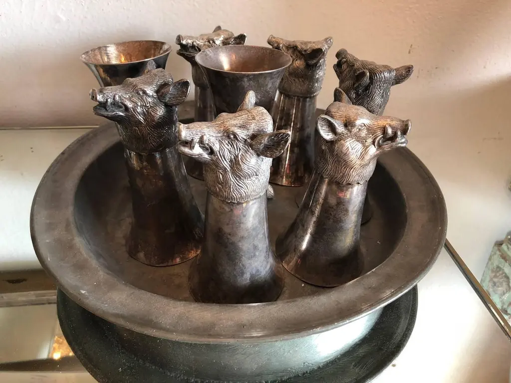 Collection Of Silver Plated Liqueur Cups In Decorated In Wild Boar Deer Head