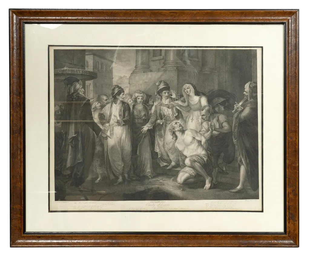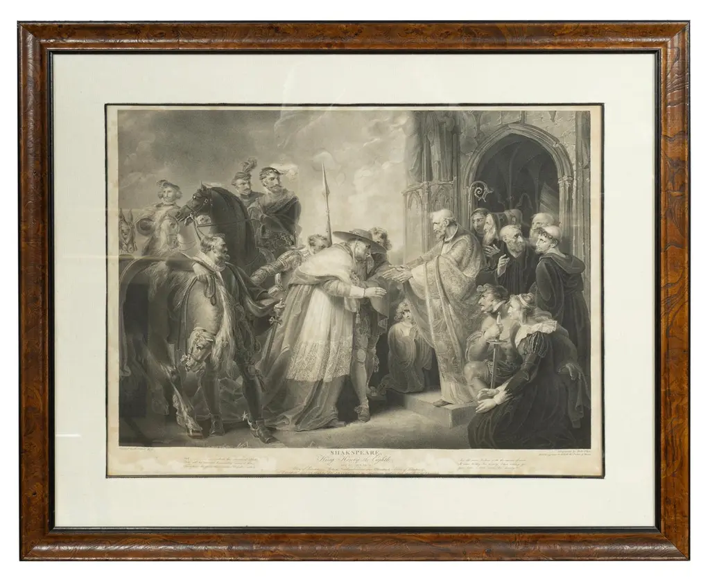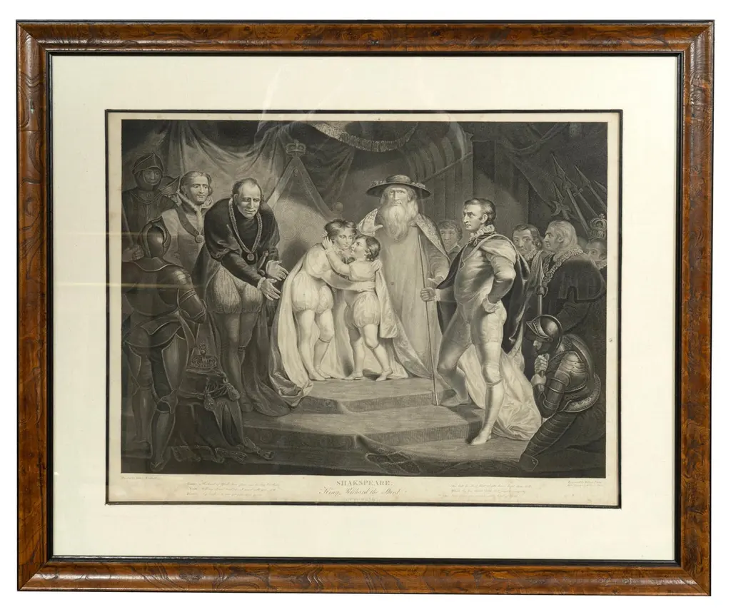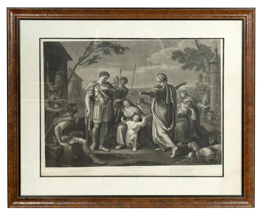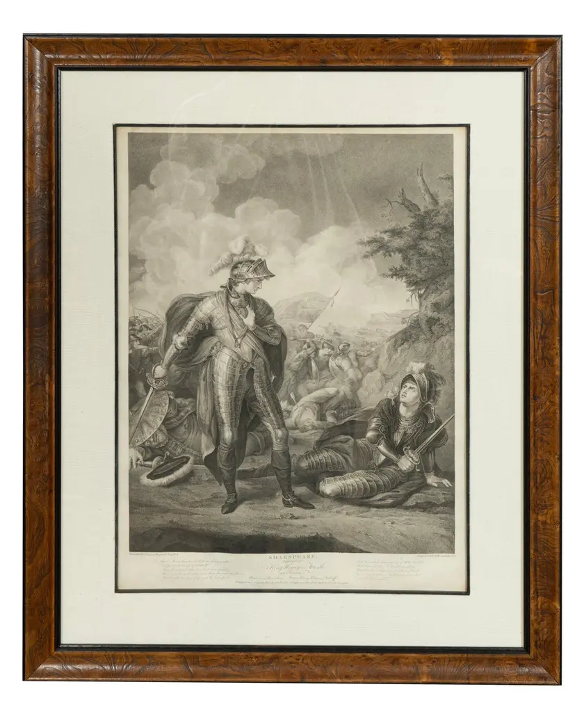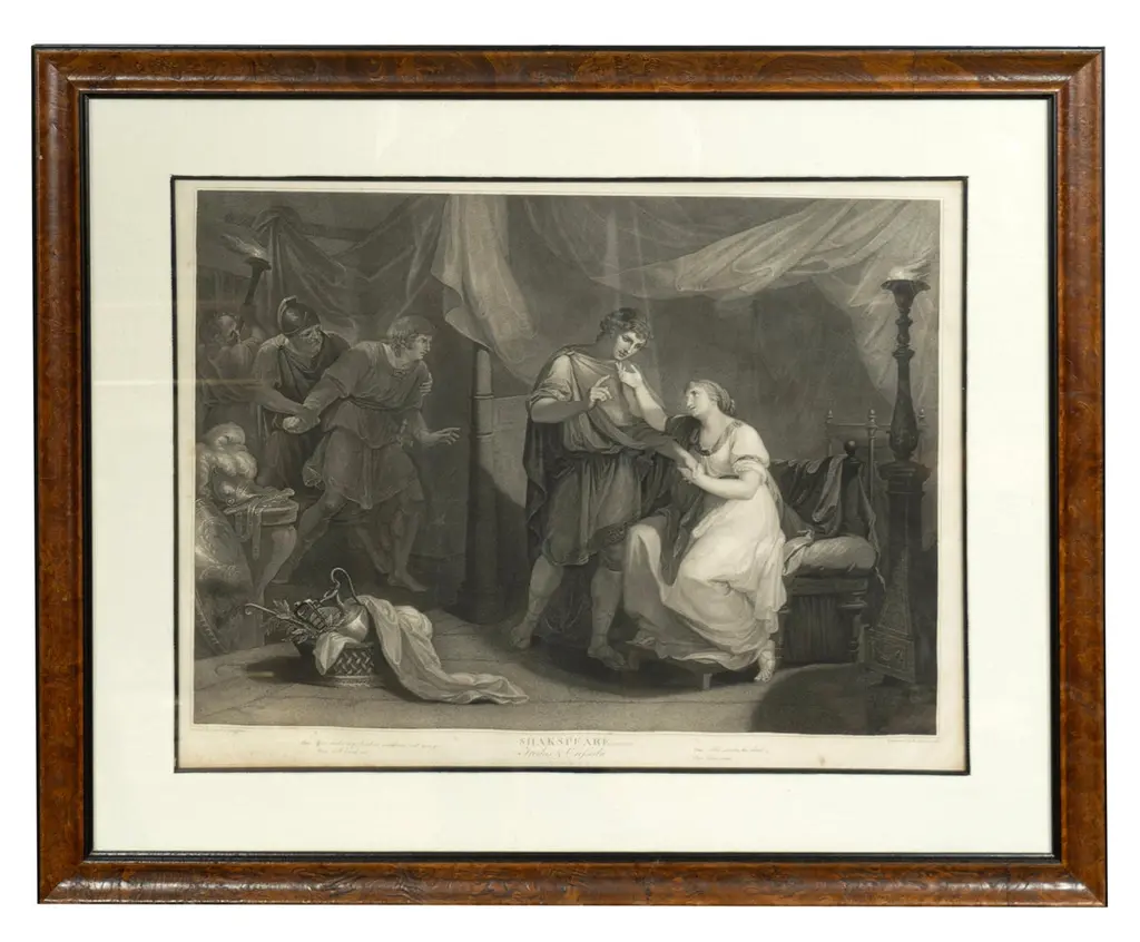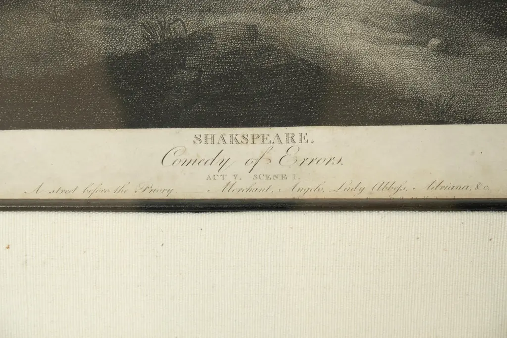 Six framed scenes from Shakespeare plays. Ca 1798 and published by Boydell. The Shakespeare gallery opened on Pall Mall in 1789, the inspiration of print publisher John Boydell based on the enormous interest in Shakespeare at the end of the 18th century. These are from a large folio book.Nicely framed.
