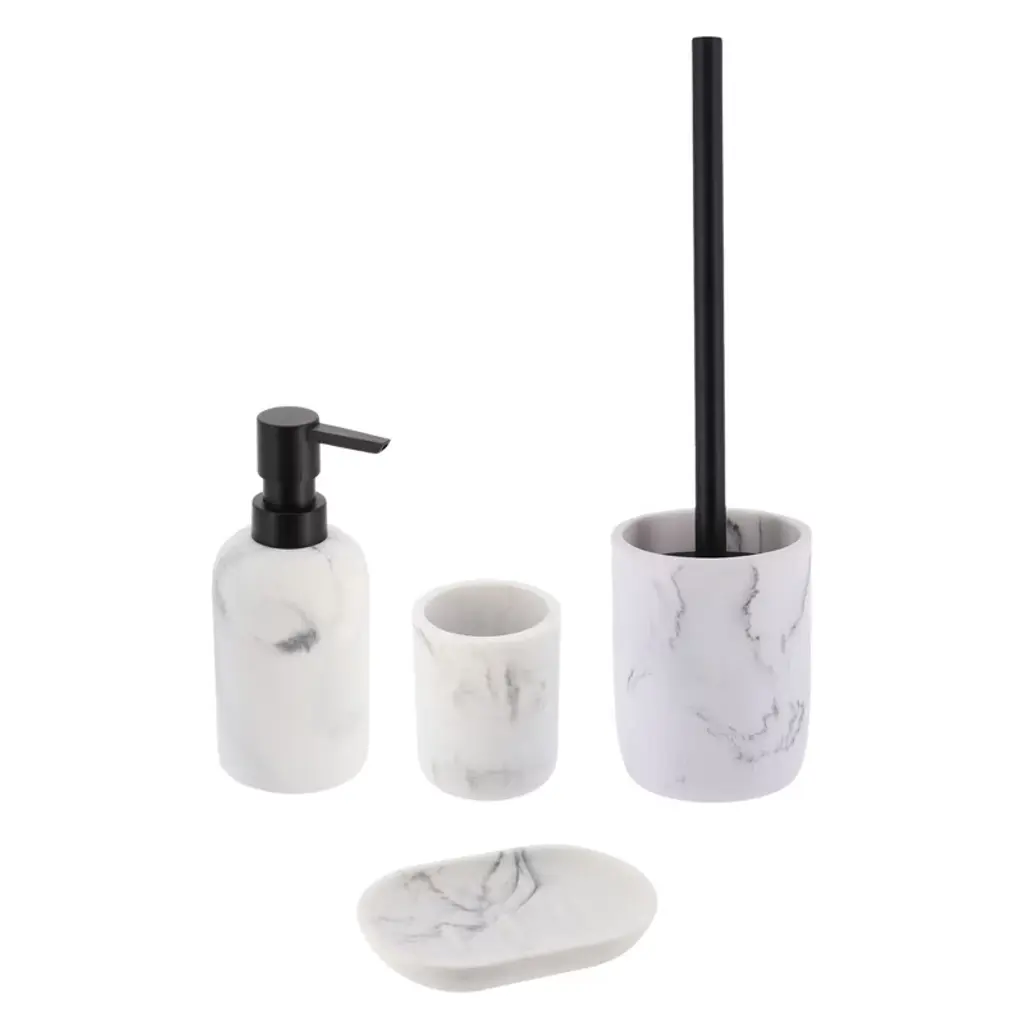 Grace your bathroom vanities with elegance and modern style using this stone effect bath accessory Set 4-pieces . If your bathroom counters look a little cluttered, you may need to upgrade your space with these bathroom accessories. Stop throwing your bathroom essentials all over the counter and use one of these convenient sets instead. Actually Evideco's bath sets are designed to be enjoyed individually or as a whole. With offerings such as soap dispenser, tumbler, toothbrush holder, soap dish cup, vanity tray, waste basket or toilet brush holder. Indeed, adding style to your bathroom, kitchen, laundry or for your vanity décor is easier than ever. A collection of useful holders, trays and organizers makes getting through morning and evening routines joyful and easy. Moreover, our bathroom accessories sets offer style and décor, no matter what design you love. Plus, they're durable and made with easy-to-clean materials. We offer plastic, ceramic, bamboo, acacia and stainless steel materials that won't rust after use .In short, our bath accessory set will complete your new bathroom look in seconds. But also, it will allow you to neatly arrange your bath essentials with style. Enjoy this stone effect bath accessory Set 4-pieces to freshen up your countertops and bring style to your home in seconds."