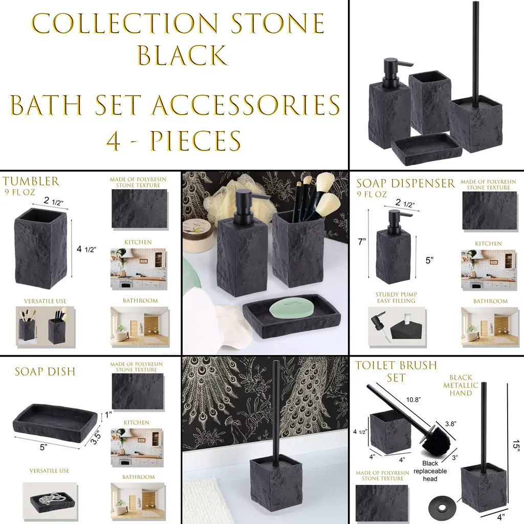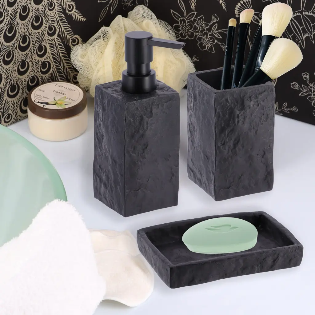Collection Stone Effect Bath Accessory Set-4 Pieces - Full Set 4 Pieces - Black