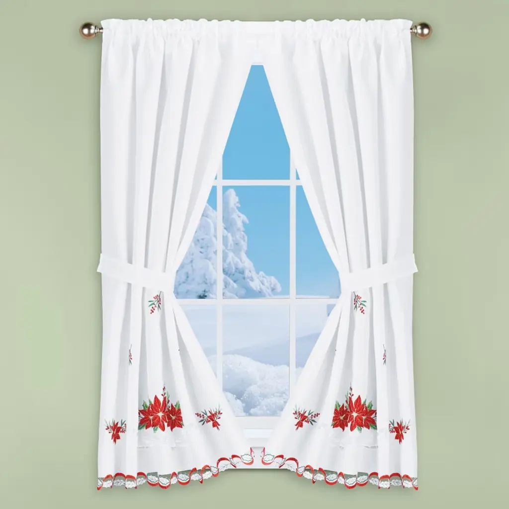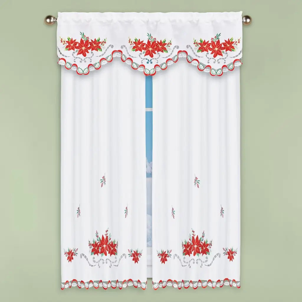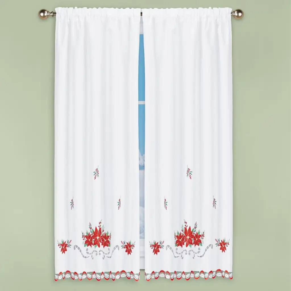 Add Some Seasonal Color To Your Home With These Festive Curtains. They Feature Embroidered Poinsettias, Cut-Out Details, Plus Holly Accents Along The Bottom Of The Panels And Valance. The White Curtains Are Finished With Red Trim Along The Scalloped Edges, And They Have Rod Pocket Tops For Easy Hanging. Panels Include Tiebacks. Machine Wash. Polyester; Imported. Choose: Valance (15"L X 58"W), 63" Panel (63"L X 42"W) Or 84" Panel (84"L X 42"W).