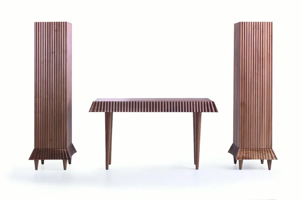 Enrich your living space with the Column, a unique creation by the renowned Ugo La Pietra, where artistry meets functionality. This singular piece, characterized by a sleek column design, features an elegant door that conceals and reveals in a dance of sophistication.Crafted with meticulous detail, the Column is finished in a natural honey walnut, adding warmth and timeless appeal to its aesthetic. The plissè or pleated effect further enhances its visual intrigue, adding a touch of dynamic texture to the smooth, natural grain of the wood.Beyond its practical utility, the Column stands as a testament to Ugo La Pietra's design philosophy—blending form, function, and artistic expression. Elevate your home with this distinctive piece, where every detail tells a story of craftsmanship and contemporary elegance. Indulge in the beauty of natural honey walnut and the mesmerizing plissè effect, making the Column a focal point that transcends mere furniture, becoming a conversation piece in your curated living space.