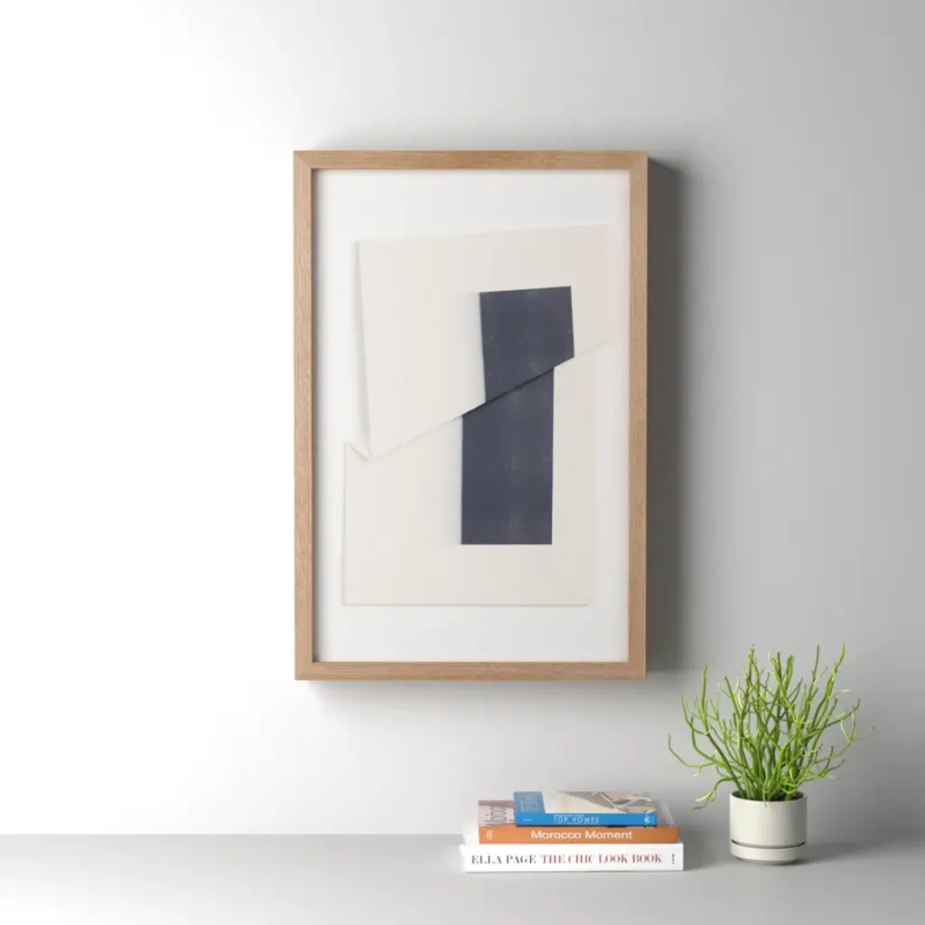 Subtle + captivating. Discover the world of abstract art with this framed wall print by New Mexico-based artist David Gray. Inspired by daily mindfulness, Gray's work features dyed, folded paper with hues of deep navy blue, creating a modern and intriguing visual experience. This piece is carefully framed within vertical grain white oak, offering a museum-quality look that elevates your home decor. Handmade in Austin, Texas, this portrait-oriented print is a single-piece item that adds a touch of sophistication to any room. Embrace the confident and smart style of this wall art print and let it spark conversations in your living space. Mounting hardware included.