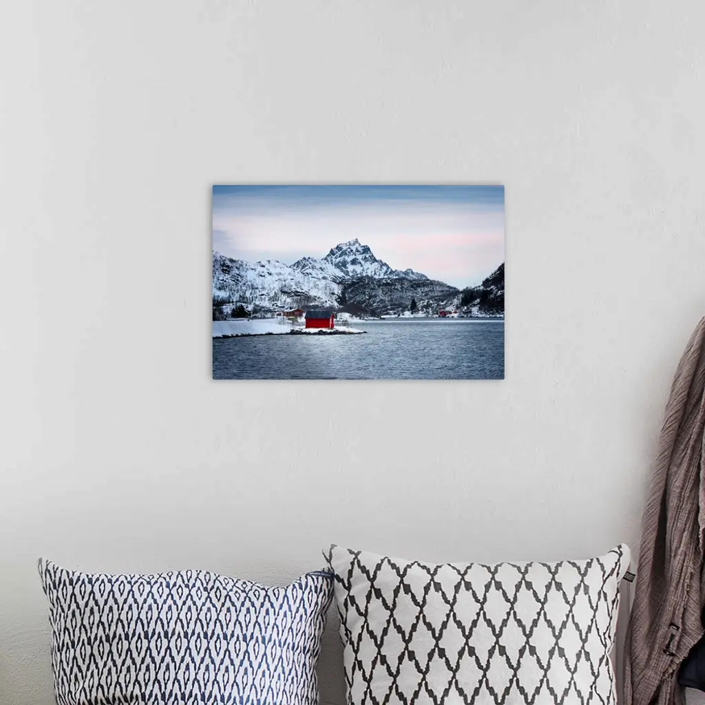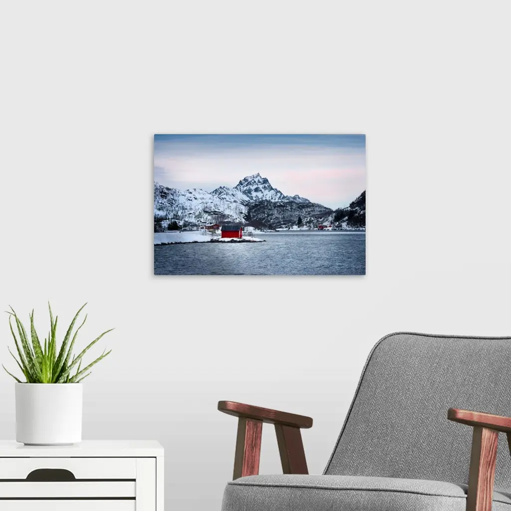 A photograph of a red building sitting on the shoreline of a snowy landscape with mountains in the distance.