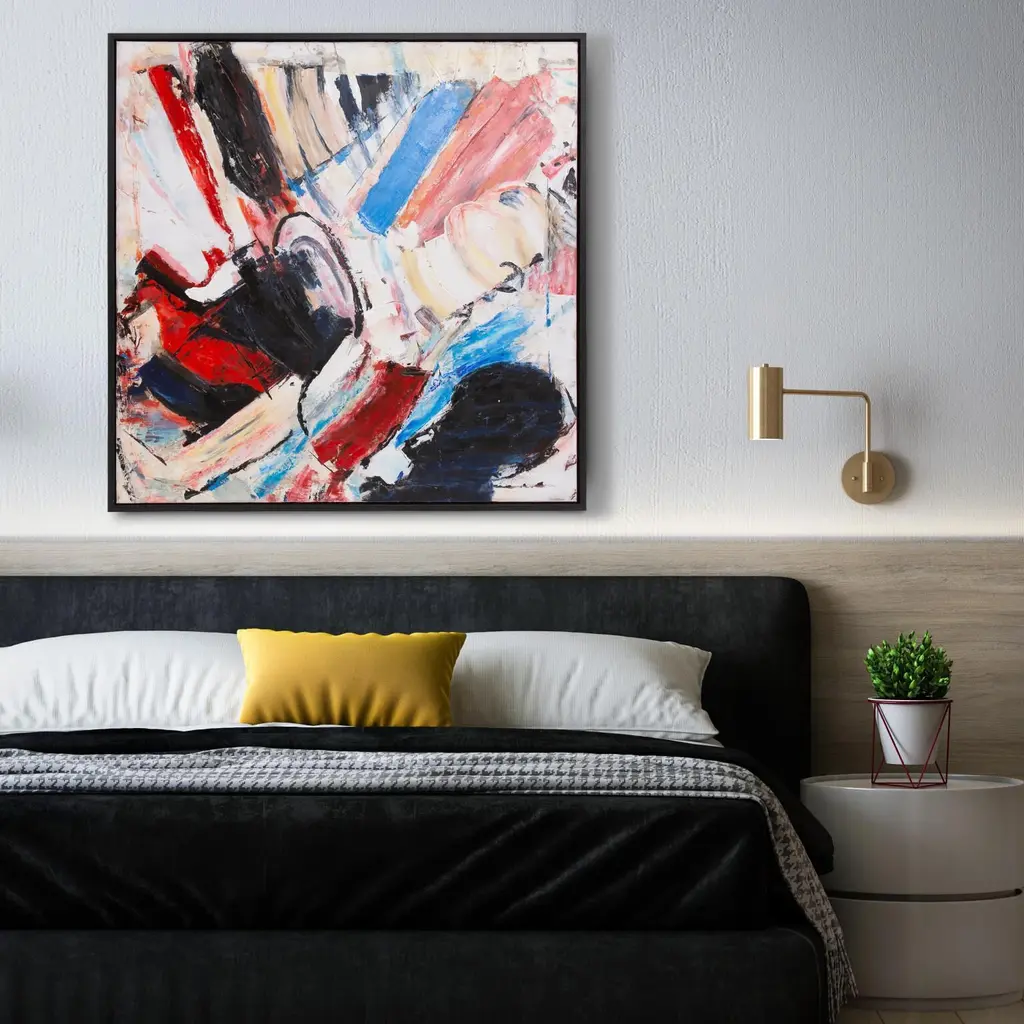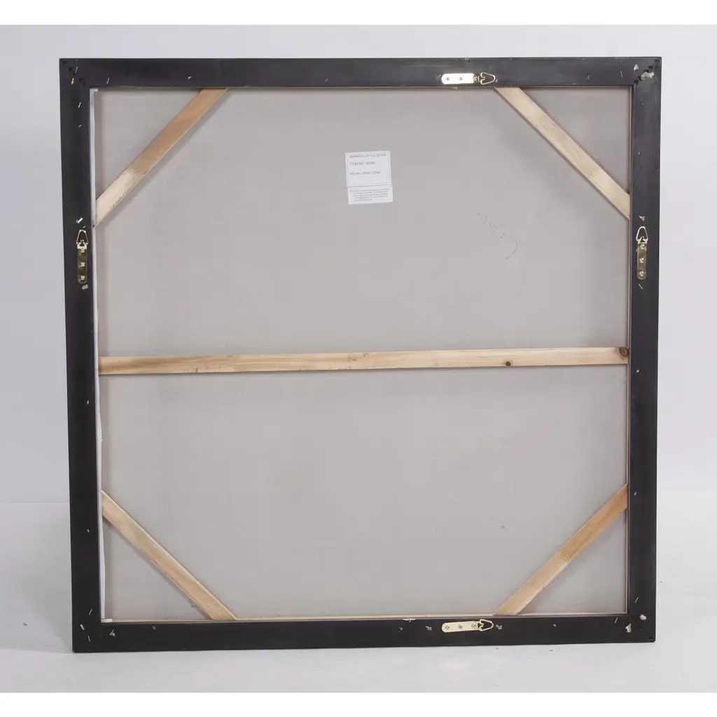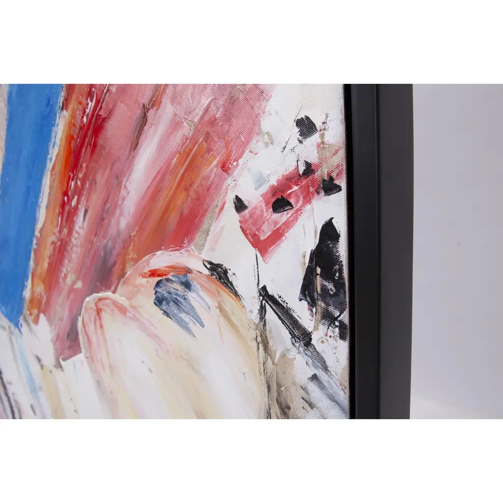The artist mind while thinking in the abstract can blend lines and materials to create new studies in something as simple as color or lines. Framed in a black floater frame this hand painted work of art blends in with contemporary or traditional works