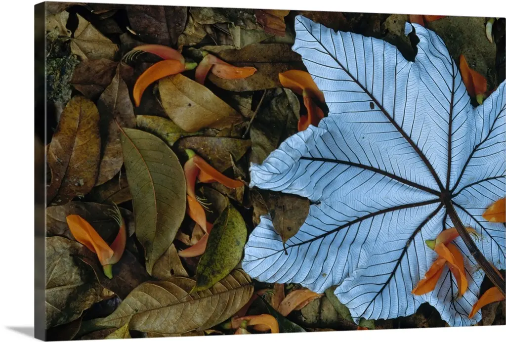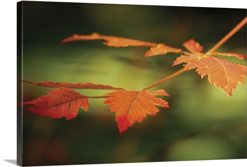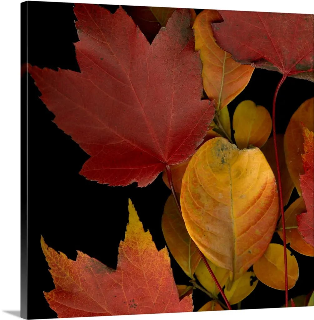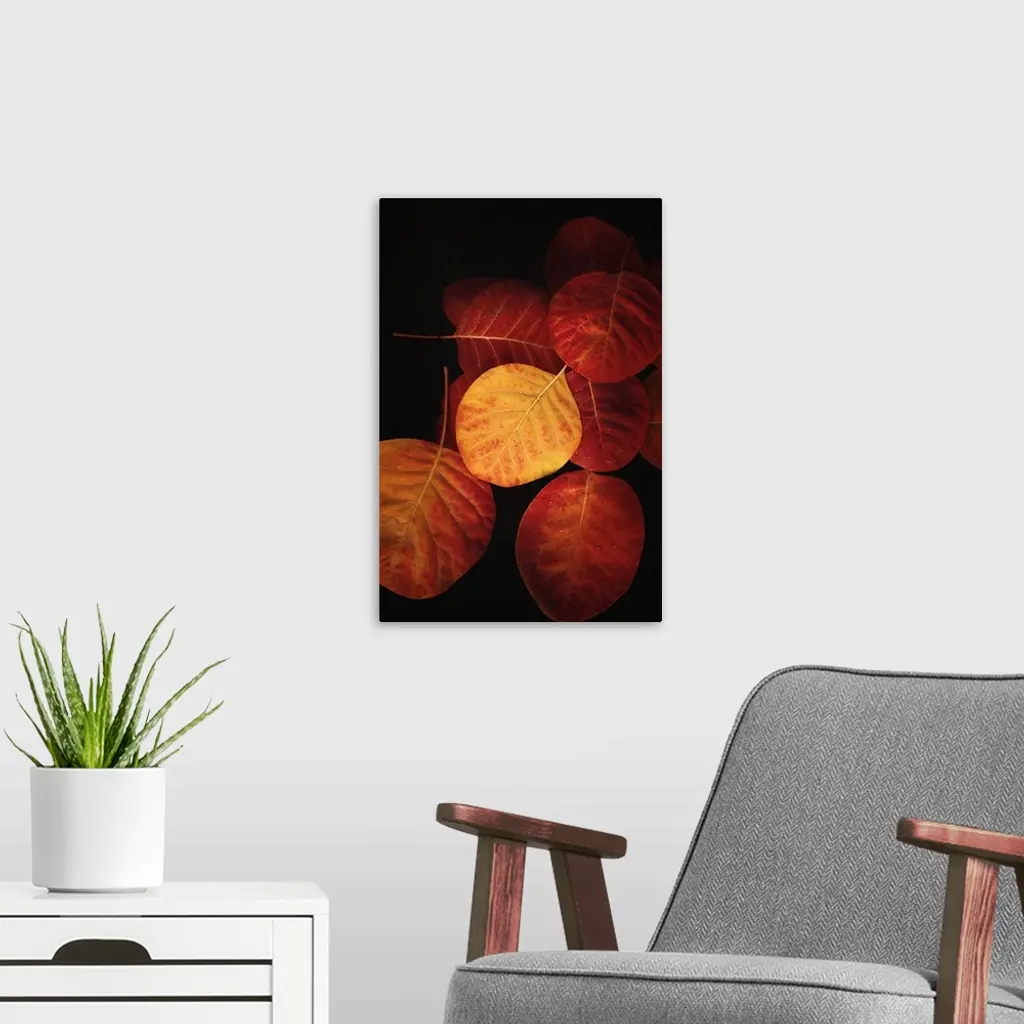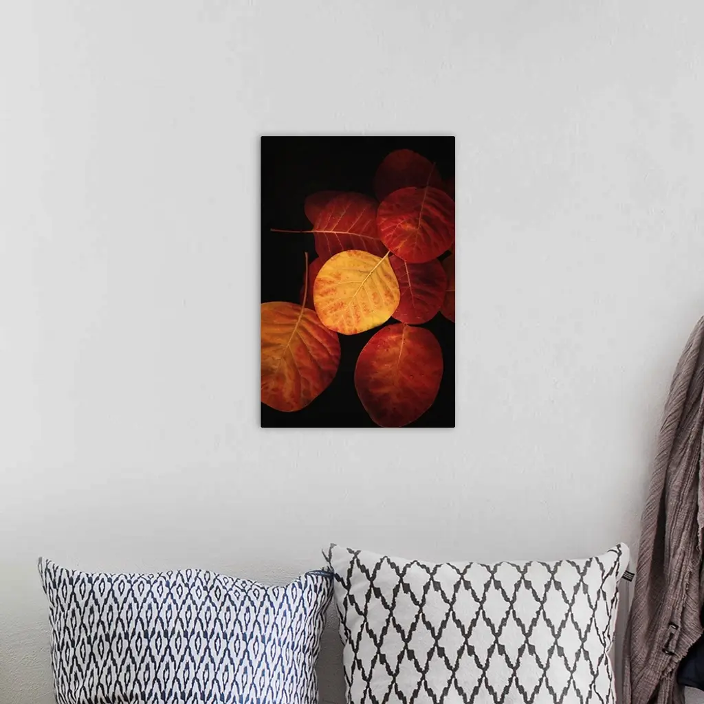 Fine art photograph of a group of autumn leaves in moody lighting.