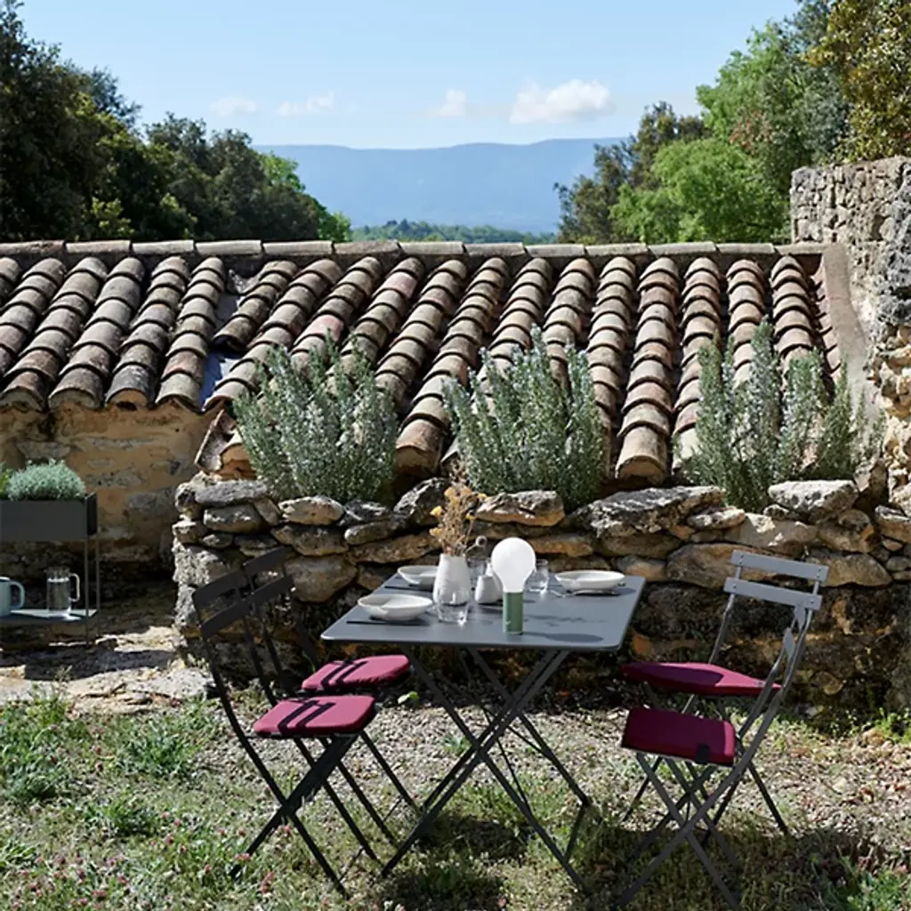 Create a poolside oasis. The Color Mix Bistro Cushion - Set of 2 by Fermob bring bright hues and ultimate relaxation to your outdoor seating experience. Showcasing a smooth texture that harmonizes with Metal chair surfaces and rounded corners to echo many bistro style chairs, the cushion sets the stage for hours of comfortable dining or lounging. Adding to the sleek design, a colorful PVC strap with an integrated press-stud easily wraps under the seat for a stable cover. Filled with high-resilience foam and wrapped in solution-dyed Dralon®, a 100% outdoor fabric that resists stains, mold and scratches, these inviting cushions make dining alfresco a colorful, comfortable event. The perfect complement for various Fermob bistro chairs.