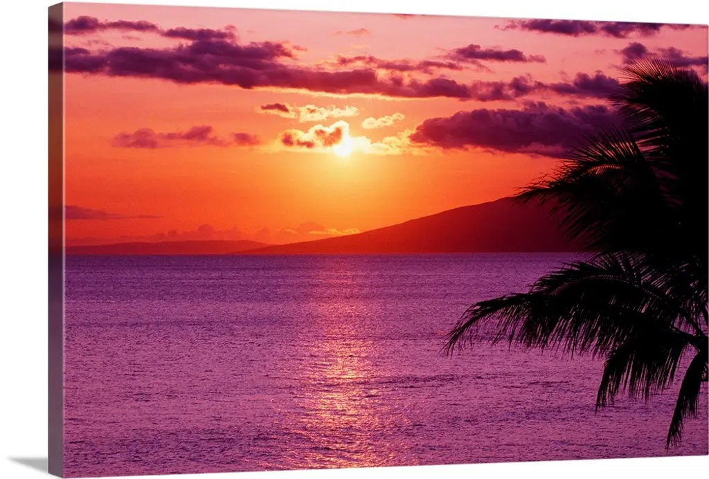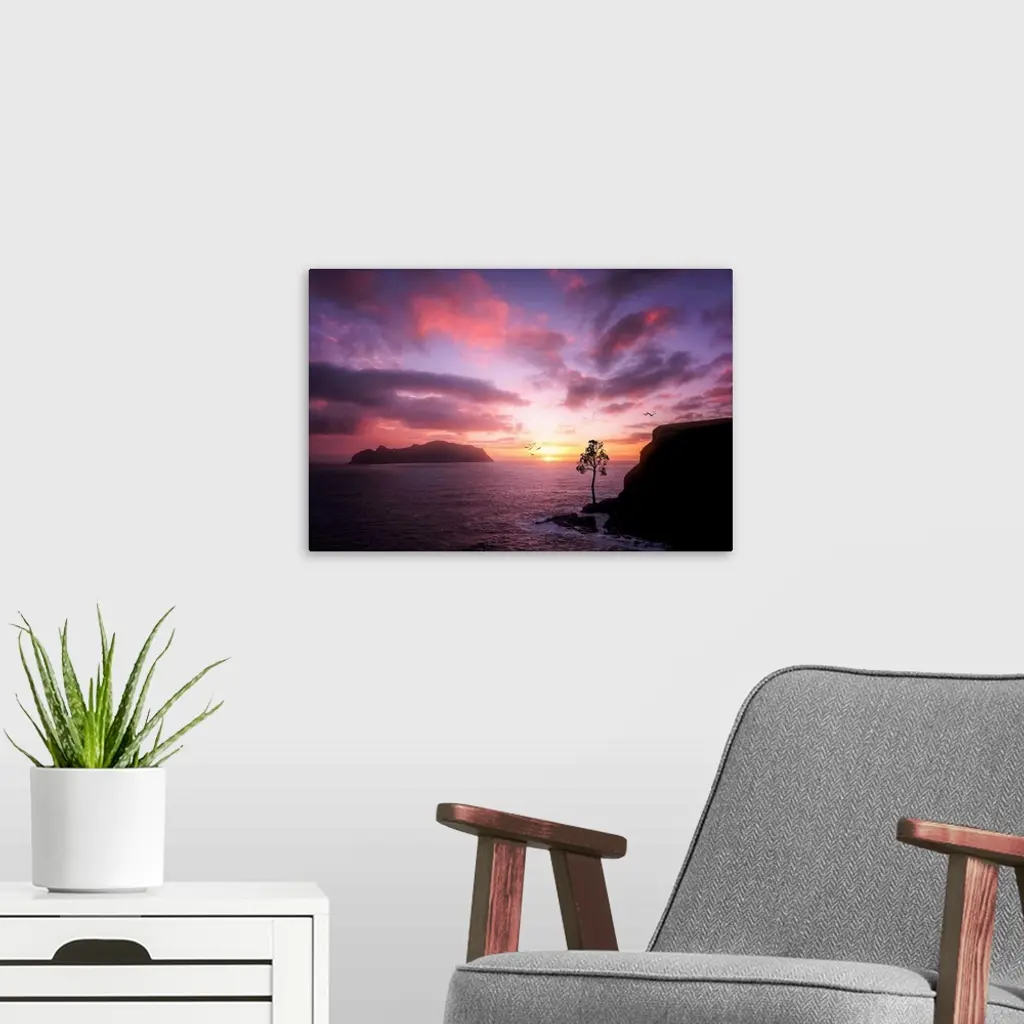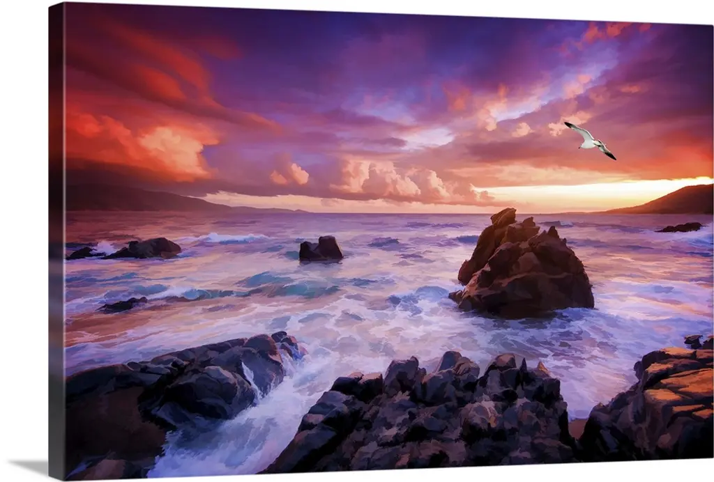 Rocky cliffs on the ocean under a cloudy sky lit up with sunset light.
