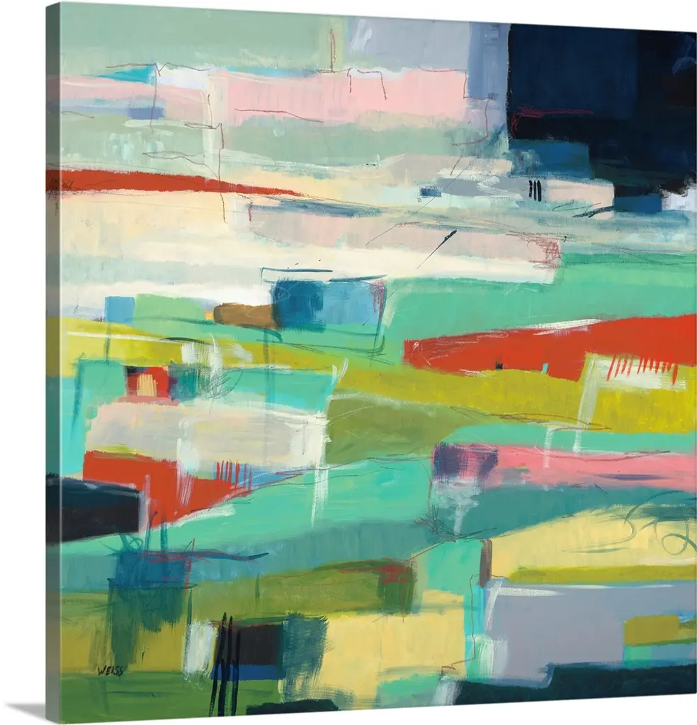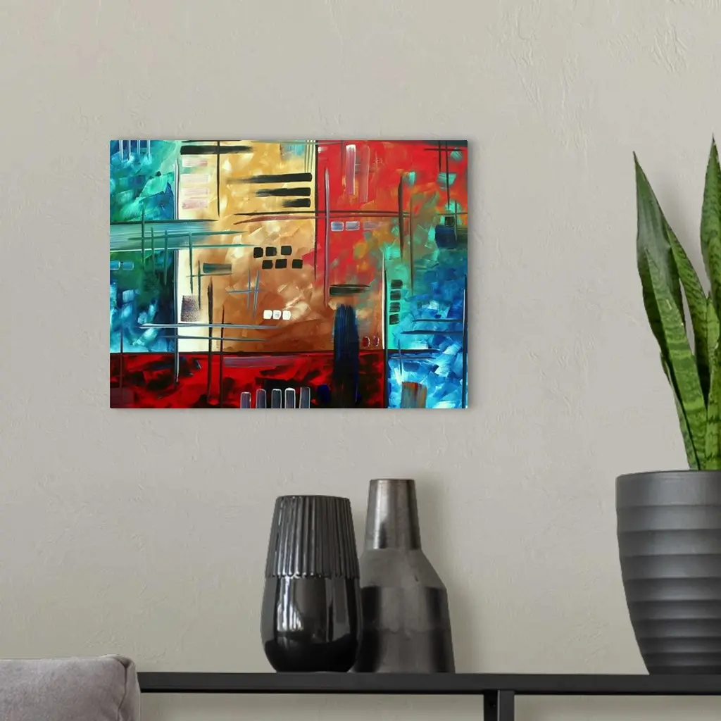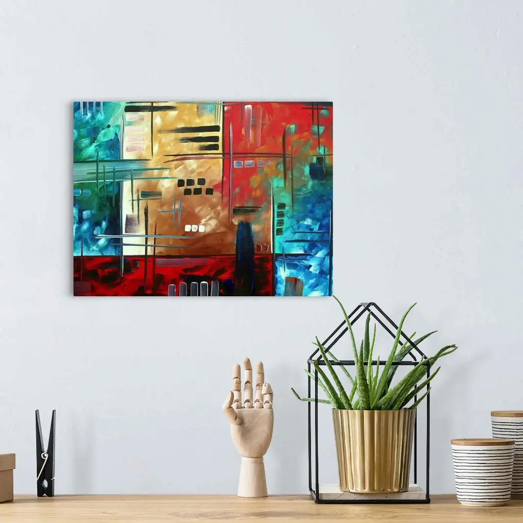 Contemporary abstract image of colorful blocks separated with lines and hatch marks with square patterns scattered throughout the image.