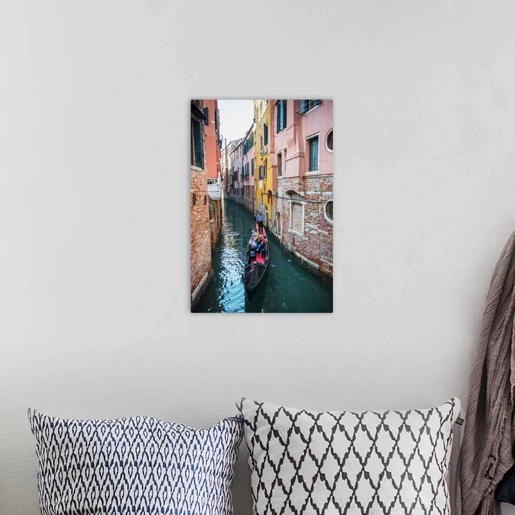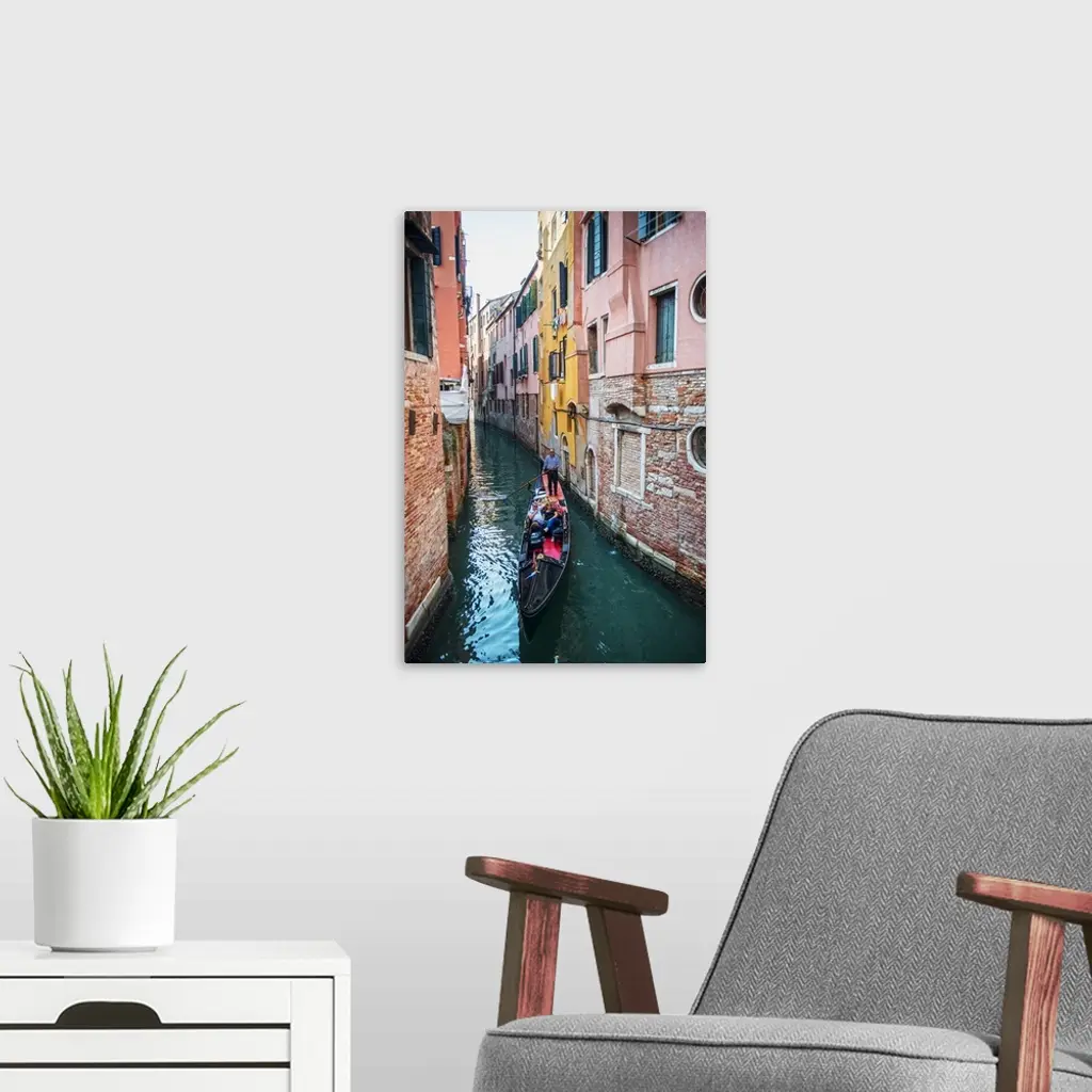Photograph of a gondola rowing though a canal surrounded by colorful building facades in Venice, Italy.