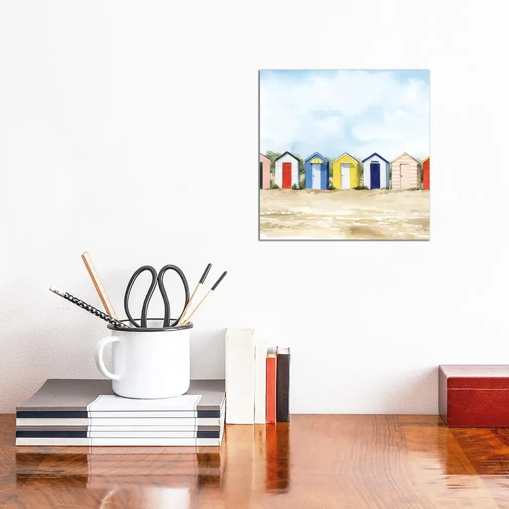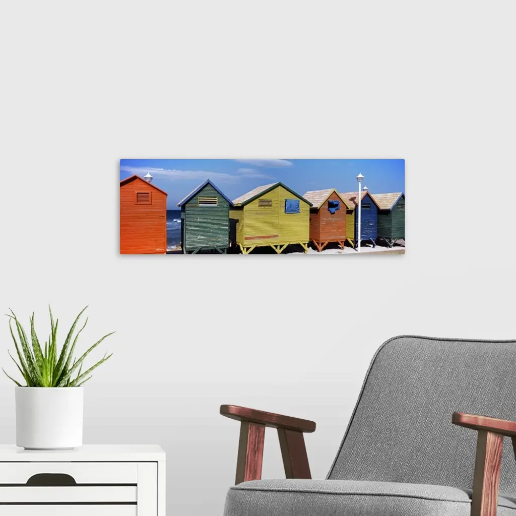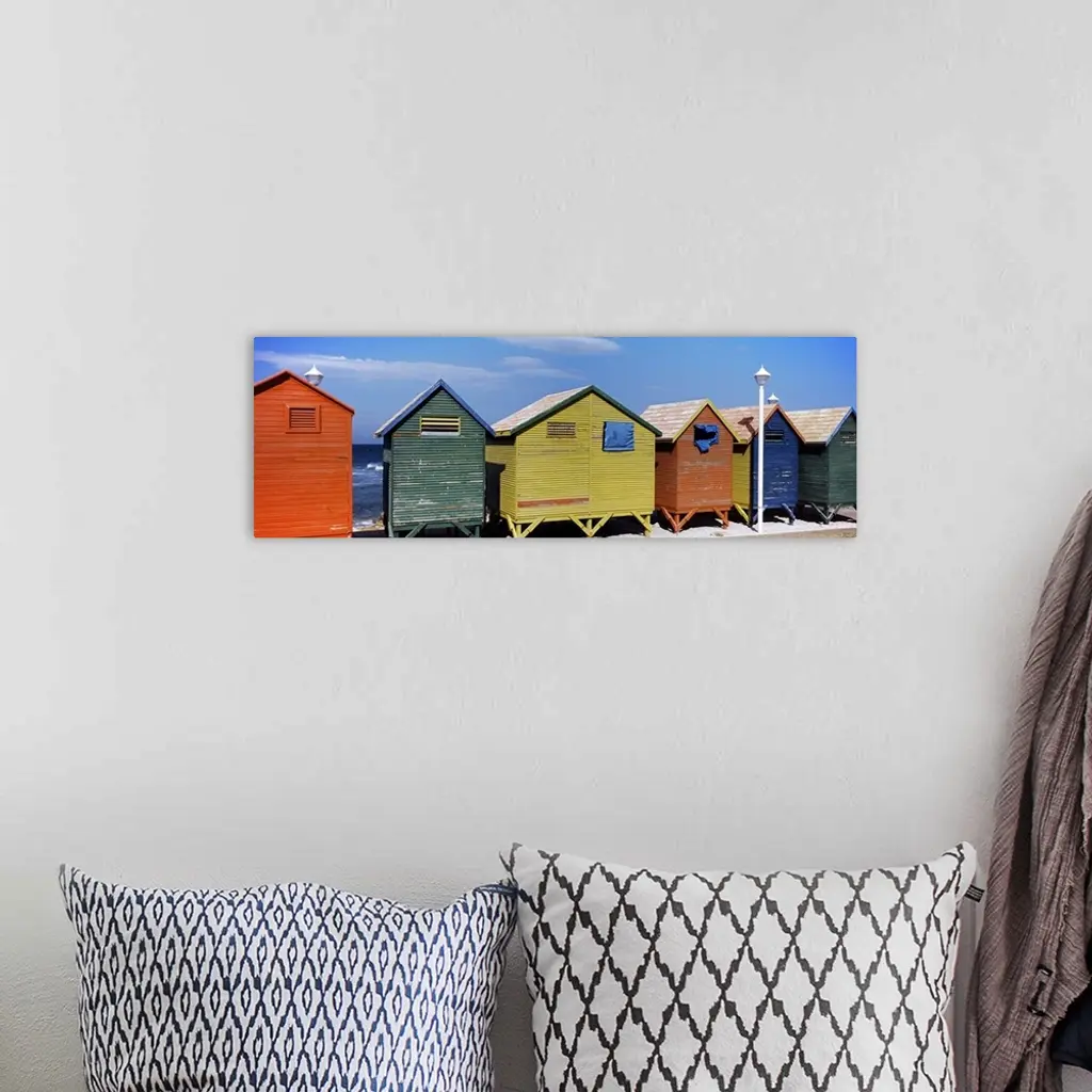 Panoramic photograph taken of multi-colored huts that line the beach with the ocean viewed in the distance.