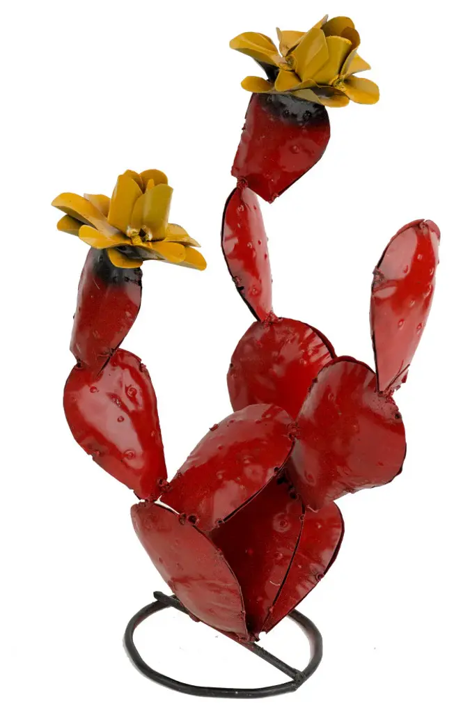 Handmade out of metal and hand painted, each individually the uniqueness and one of a kind of these cute colorful prickly pear cactus is sure to bring warmth to any any home or garden. We offer two colors. They measure about 10W x 10D x 16H inches. If you are putting them outside, we suggest several coats of a sealer, ie, polyurethane or sparathane. The photo is a representation of what you will receive, but same design, same colors, etc..just each will be one of a kind.