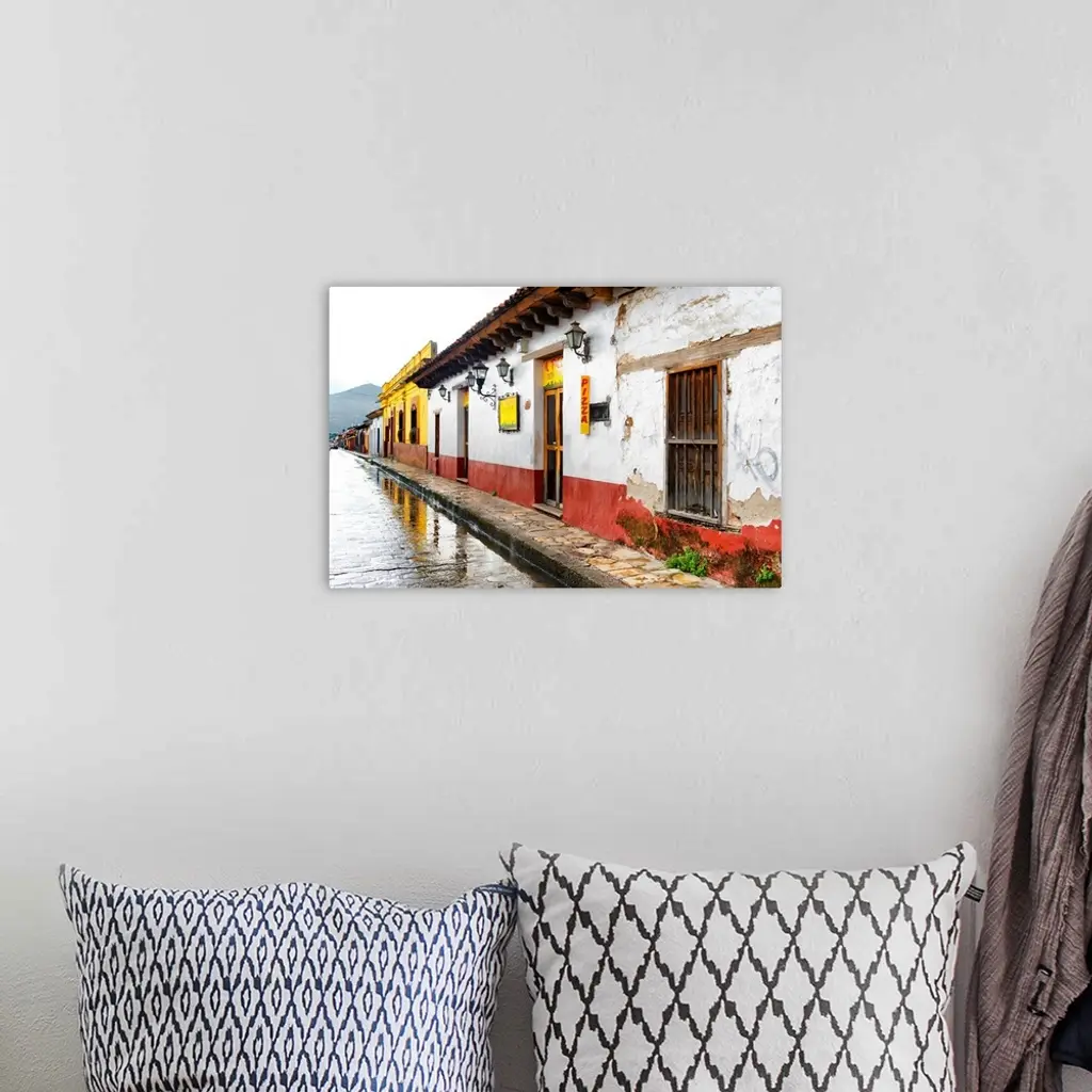 Photograph of an overcast and rainy street scene by a pizza shop in Mexico. From the Viva Mexico Collection.
