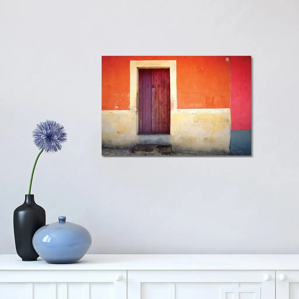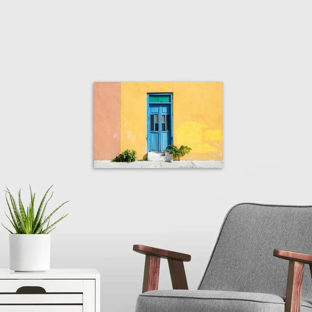 Photograph of a pale yellow and pink exterior wall with a bright blue door off the street in Mexico. From the Viva Mexico Collection.