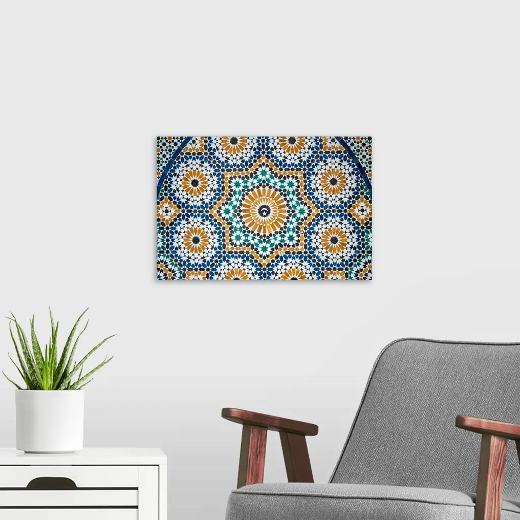 Morocco, Marrakech-Safi (Marrakesh-Tensift-El Haouz) region, Marrakesh. Colorful tiled mosaic at Marrakech Museum, housed in the 19th century Dar Menebhi Palace.