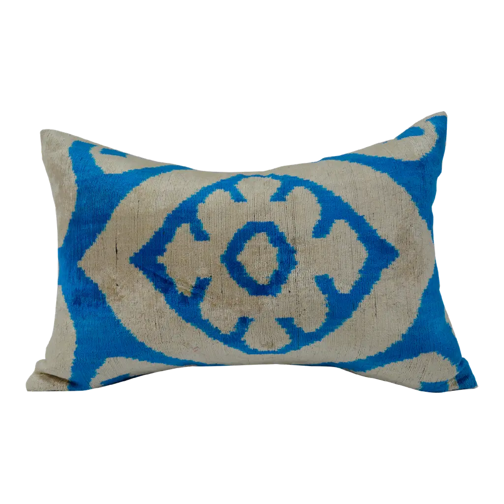 Decorative Throw Velvet Ikat Pillow -Luxurious cushion cover of handloomed ikat fabric -Insert is NOT included -Ikat is an beautiful fabric, every pillow is unique but can also contain small imperfections; the charm of a handmade product. Dimensions: 14ʺW(35 Cm) × 6.0ʺD(15 Cm) × 24ʺH(60 Cm) approx Warning: Since ikat is a handmade fabric, the width and length of the throw pillow can be a few inches smaller or larger. -Handloom 100% silk velvet fabric -Back side is cotton fabric and with hidden zipper. -Handwoven velvet pillow case only, -Hand wash 30 C or dry clean
