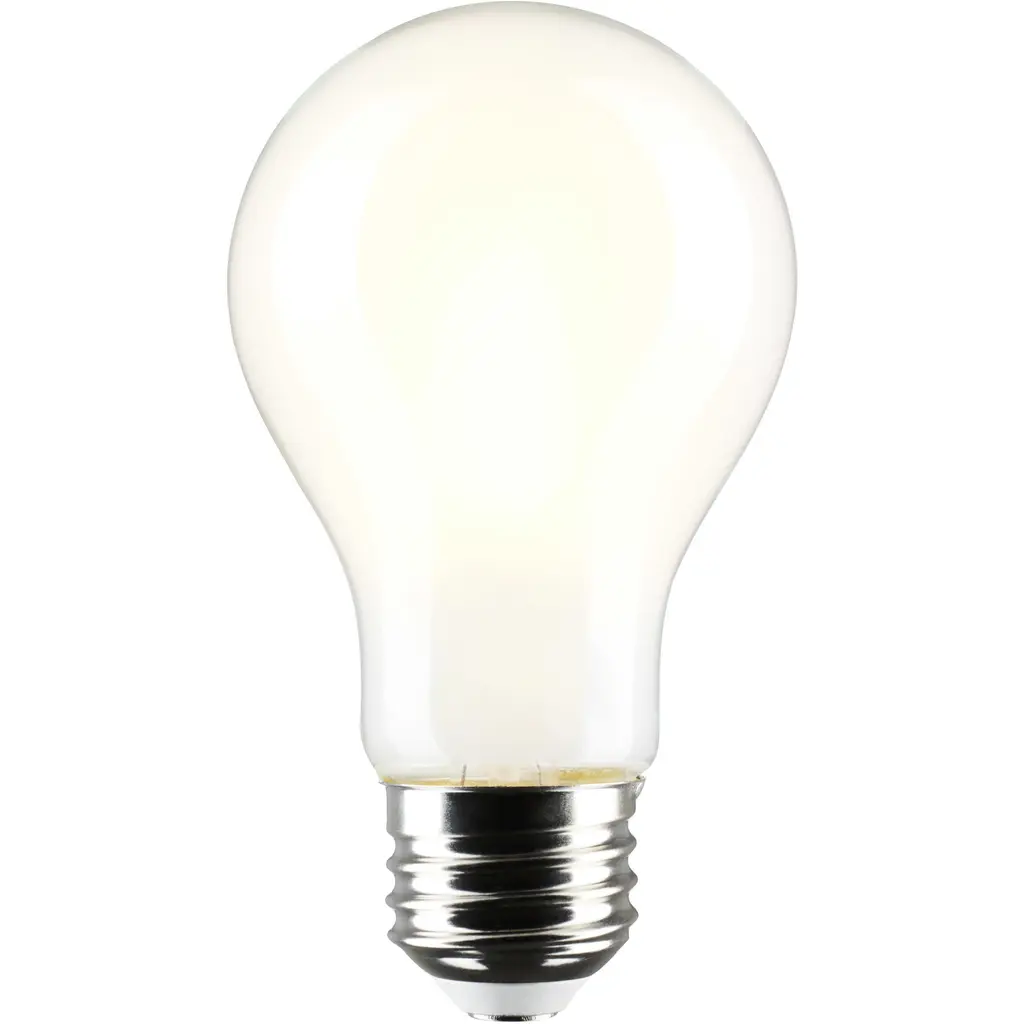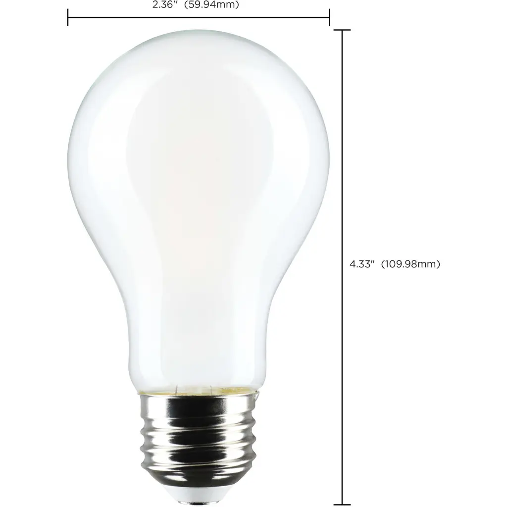 The S12151 Dim to Warm filament A19 bulb by SATCO NUVO delivers cozy, incandescent-style dimming, warming from 3000K to 2000K for an inviting atmosphere. Ideal for residential or decorative use, it features a frosted glass finish for soft diffusion, a standard E26 base, 360 degree illumination, and a 90 CRI for rich, vibrant color. Rated for wet locations and operating at 120V, it blends classic warmth with LED performance.