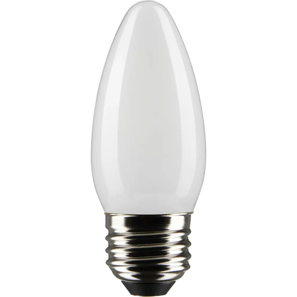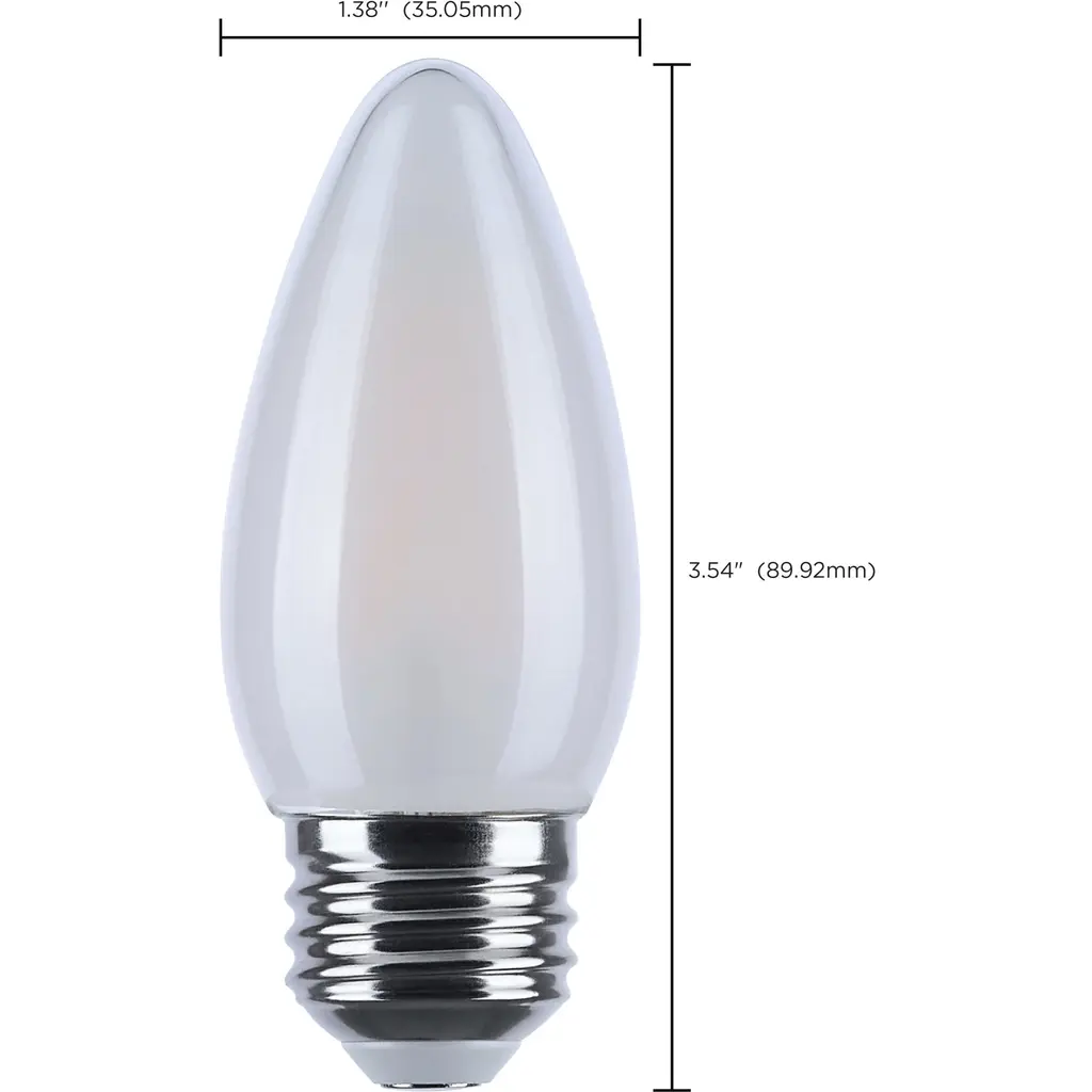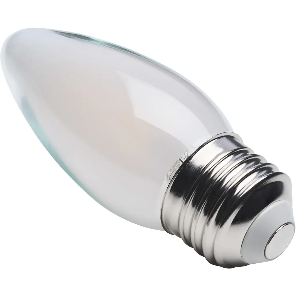 SATCO NUVO's S12160 B11 Dim to Warm filament bulb features a frosted finish for softly diffused light and a standard E26 base for easy installation. It dims smoothly from 3000K to 2000K, emulating incandescent warmth. With 360 degree light output, 90 CRI, and wet location rating, this 120V lamp enhances decorative fixtures in any environment.