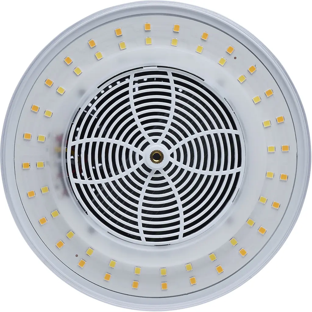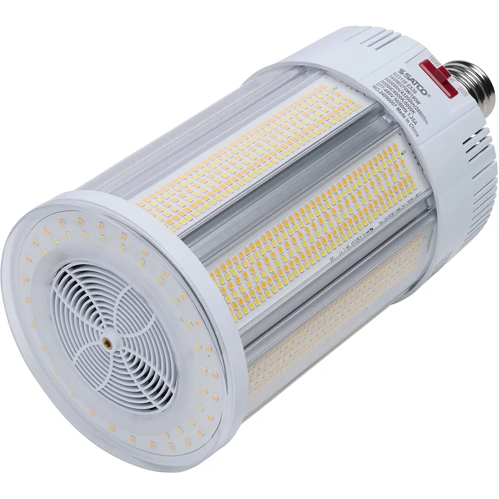 SATCONUVO's S23138 Hi-Lumen Hi-Pro lamp delivers over 59,000 lumens, replacing metal halide lamps up to 750W with energy-efficient LED performance. Field-selectable wattage and CCT provide versatility, while the extended mogul EX39 base and enclosed fixture rating suit industrial and commercial spaces like warehouses and gymnasiums. A support bracket and safety cable add extra security during installation. The Type B ballast bypass design allows direct operation on 277-480V systems. A universal operating position, active cooling fan, and 4kV surge protection enhance reliability. With a 50,000-hour lifespan and a 5-year warranty, this lamp ensures long-lasting, high-lumen output.