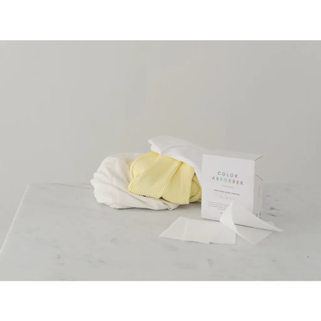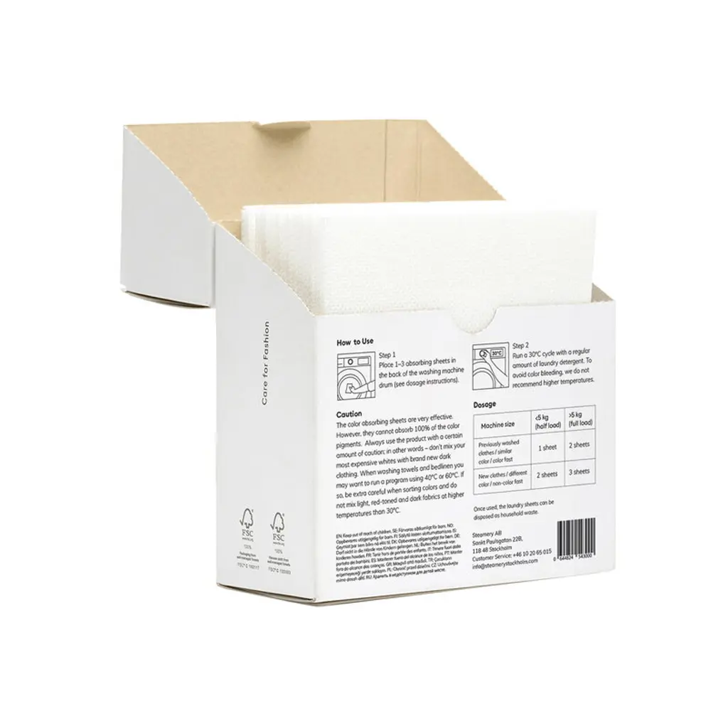 Steamery's color absorbers allow you to was colorful and light-colored clothes together without having to fear discolouration. As their name suggests, the sheets absorb loose color pigments, preventing them from being transmitted to other textiles in the washer. However magical lifesavers the color absorbers may seem, they cannot absorb 100% of the color pigments – therefore, we do not recommend washing your lightest and darkest garments together, or throwing new red socks in the same wash with your favorite white shirt. New clothes should be washed with similar colors at least five times before mixing colors. How to use color absorbers? Put 1–3 color absorber sheets in the back of the washer drum. Wash your textiles as you would at 30°C (the sheets are not recommended for high temperatures). The sheets will naturally dissolve after one use.